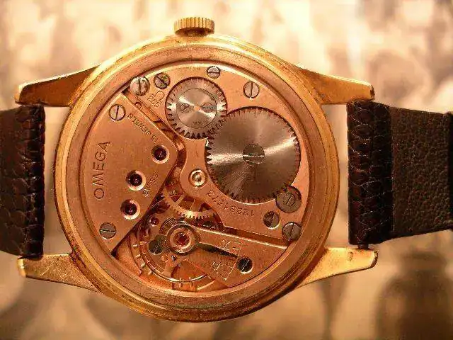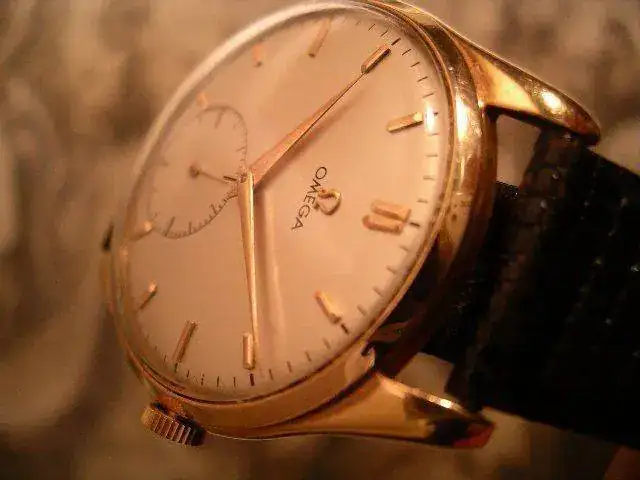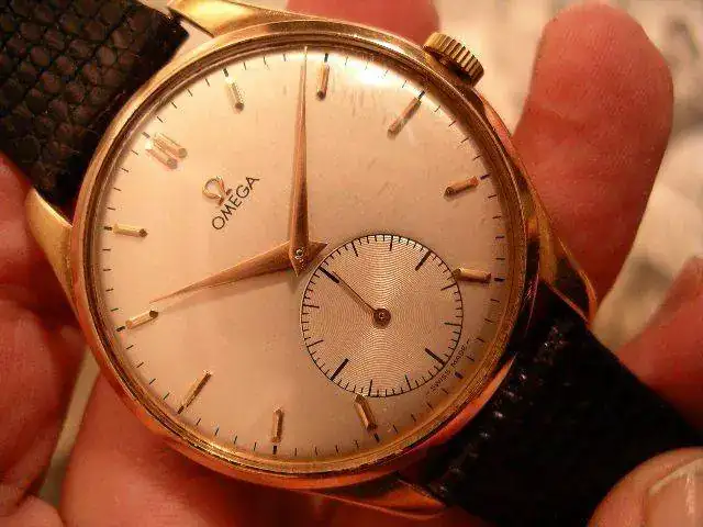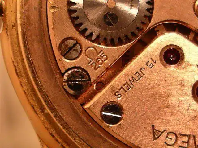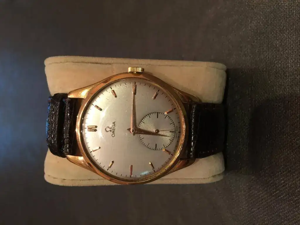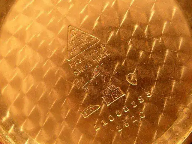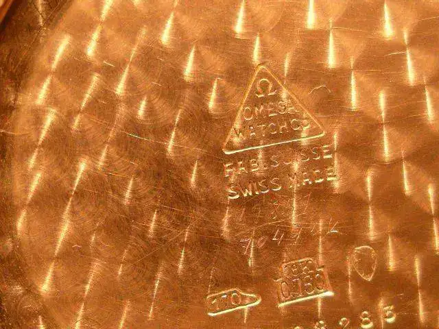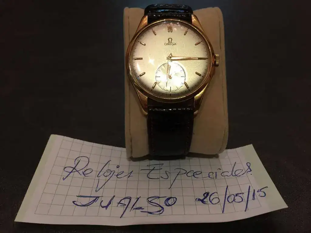 Precioso reloj OMEGA en oro de ley de 18K, cuadruple firma. Como puede verse en las fotos, la robusta caja presenta tapa trasera con cierre a presión, punzonada con los punzones oficiales de oro de origen suizo (cabeza de la diosa Minerva) 18K 0.750, numerada y firmada por la marca. Esfera color hueso, firmada OMEGA a las doce horas, SWISS MADE bajo el registro para los segundos situado a las seis horas. Manecillas originales estilo "dauphine". Maquinaria mecánica de carga manual, firmada y numerada por la marca, calibre 265.