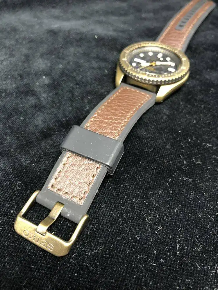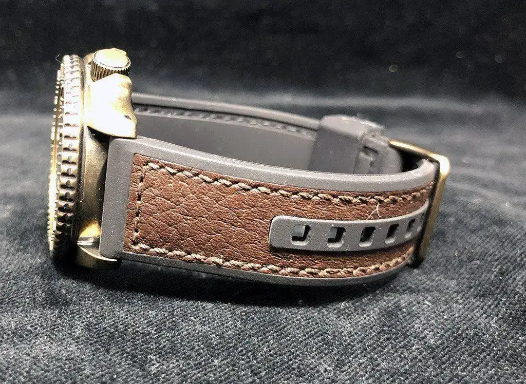 Correa combinada de caucho negro y piel marrón, con cierre por hebilla.