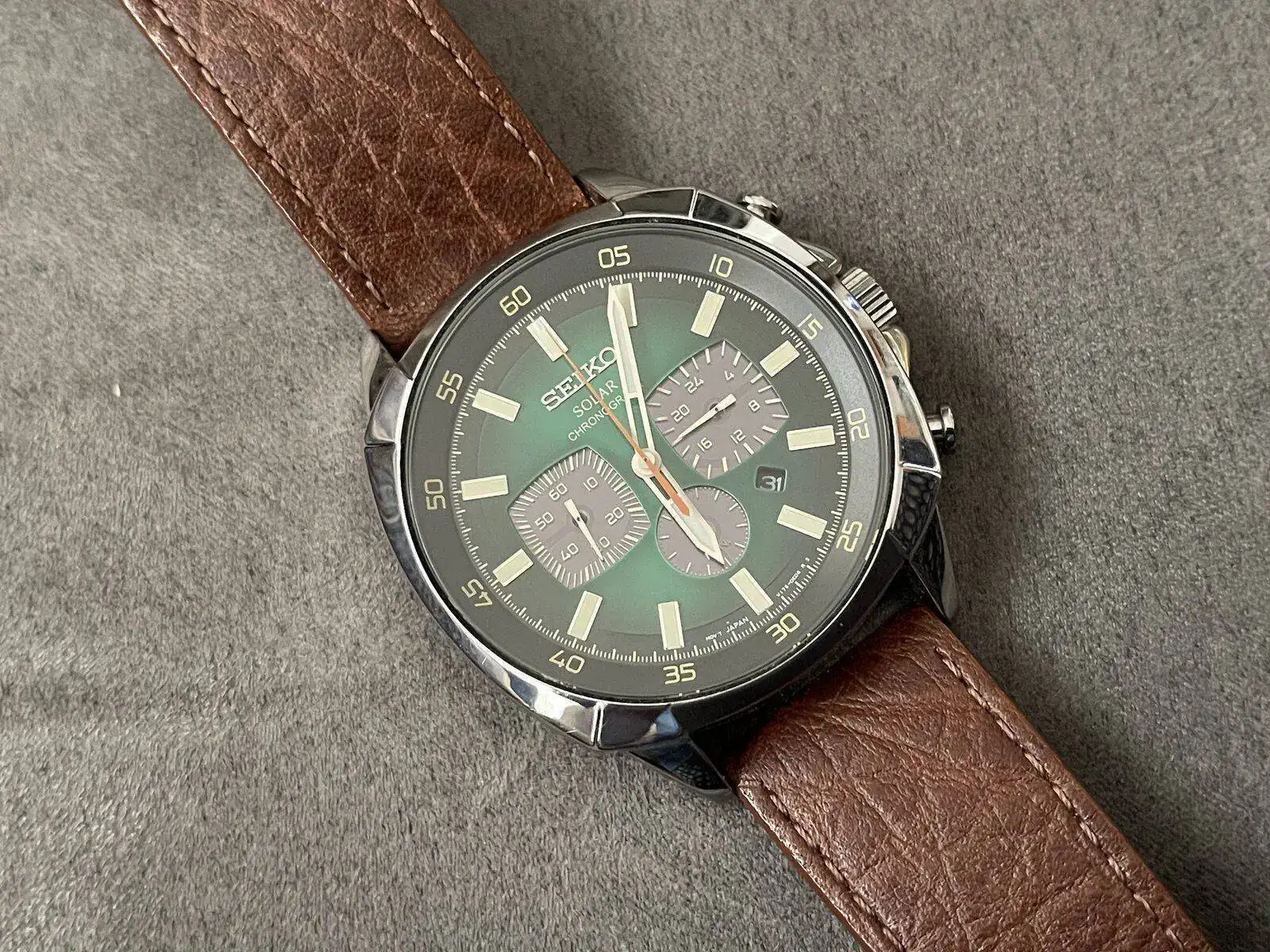 Es un reloj elegante que cuenta con una preciosa esfera verde oscura degradada que absorbe la energía del sol para alimentar el reloj y cuando esta plenamente cargado puede funcionar hasta seis meses.