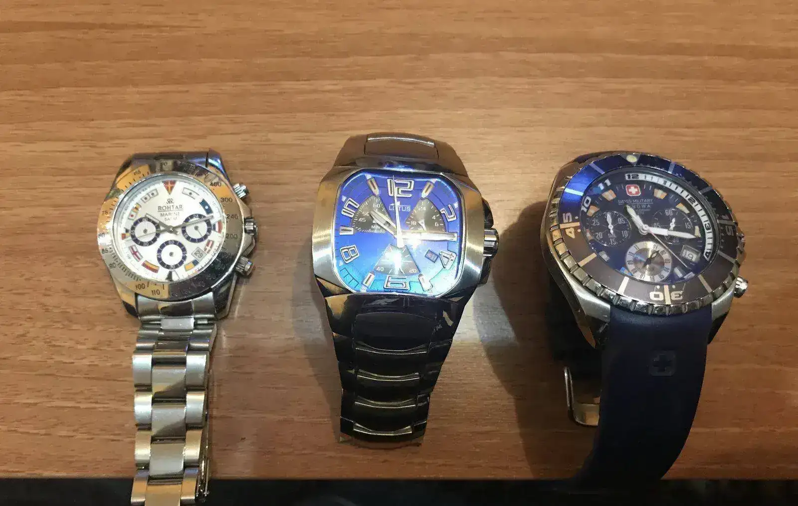 Sé que son gamas bajas, siguen funcionando porque un buen relojero les metió mano, pero el primero y el tercero tienen el mecanismo muy tocado, al Swiss no puedo cambiarle la hora. El Lotus tiene unos 18 años y salvo esa cuestión no ha dado ningún problema.
