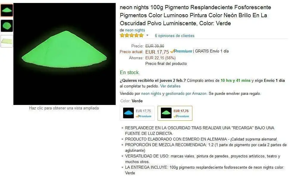 Buscando información de dónde comprar lumen, he visto unos botecitos de 4 gramos en gran.com a 14 € y en amazon hay un polvo de pigmento que 100 gramos valen 18 € aproximadamente.
