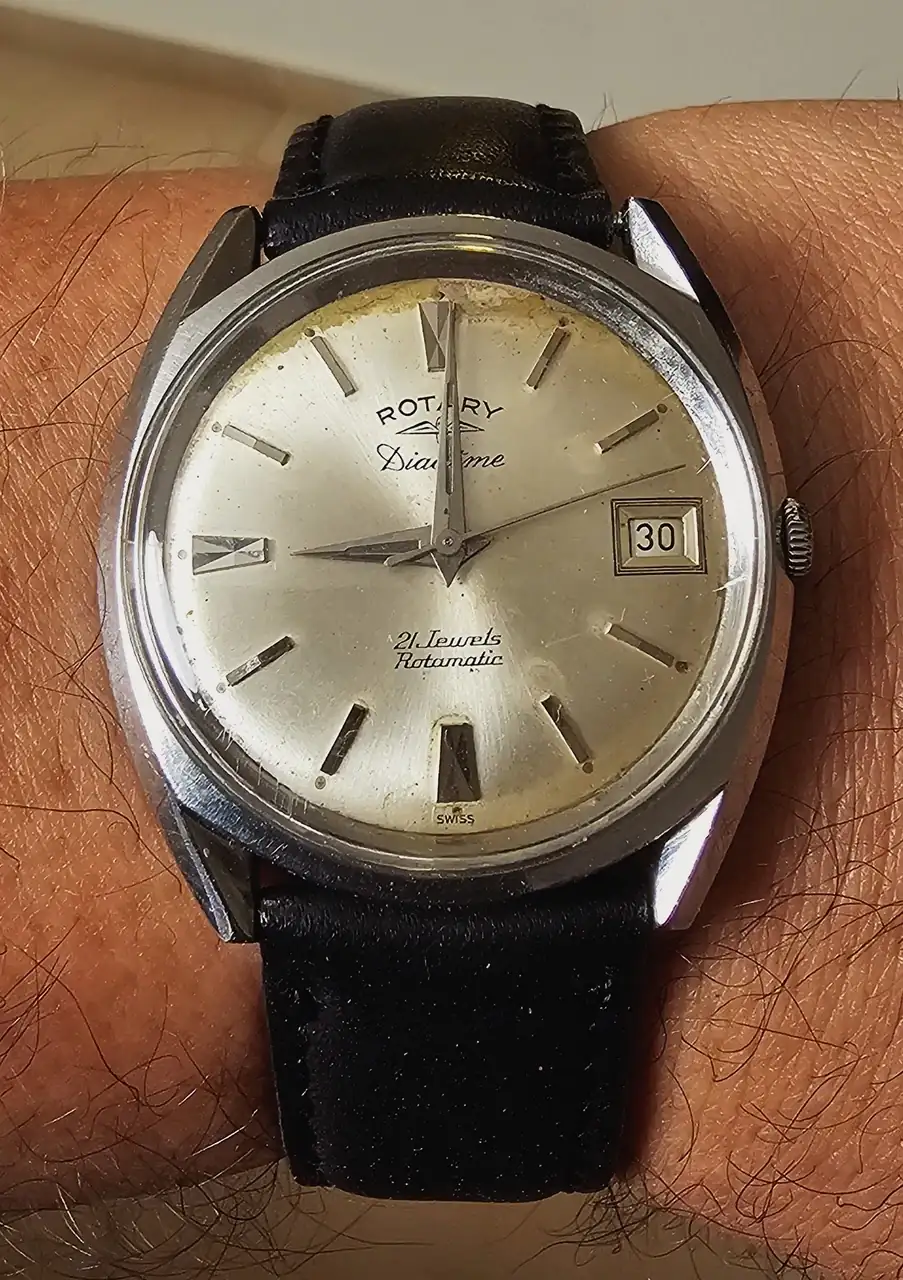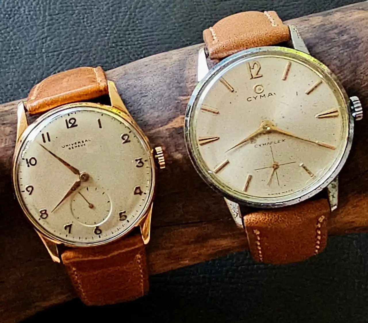 Empiezo el grupo de los vintage con tres ‘incunables familiares’ suizos: El ROTARY DIADEME que era de mi padre (esfera algo sufrida, es un automático maravilloso, con una precisión admirable y el segundero de trote más fluido de toda la colección), el precioso UNIVERSAL GENEVE de mi abuelo gallego y el CYMAFLEX de mi suegro.
