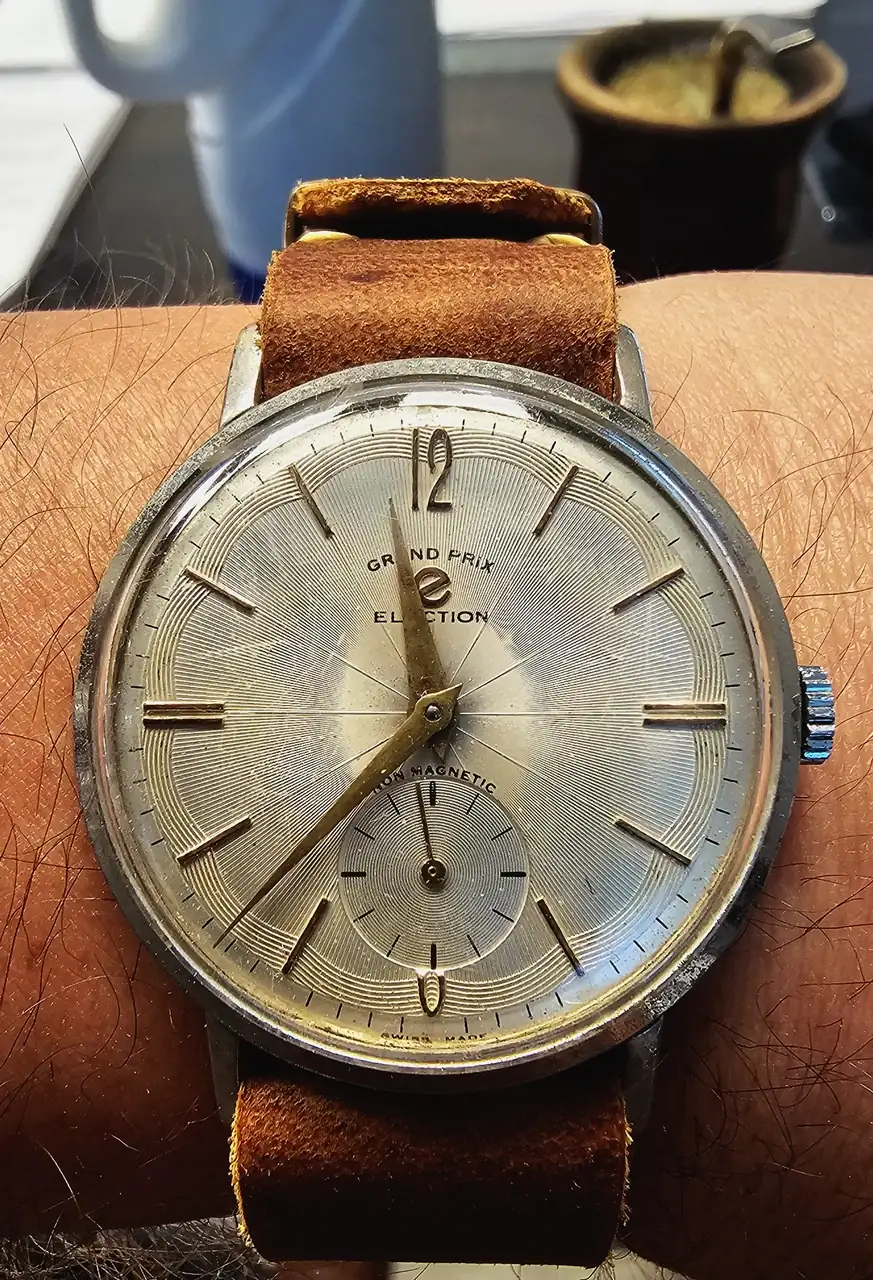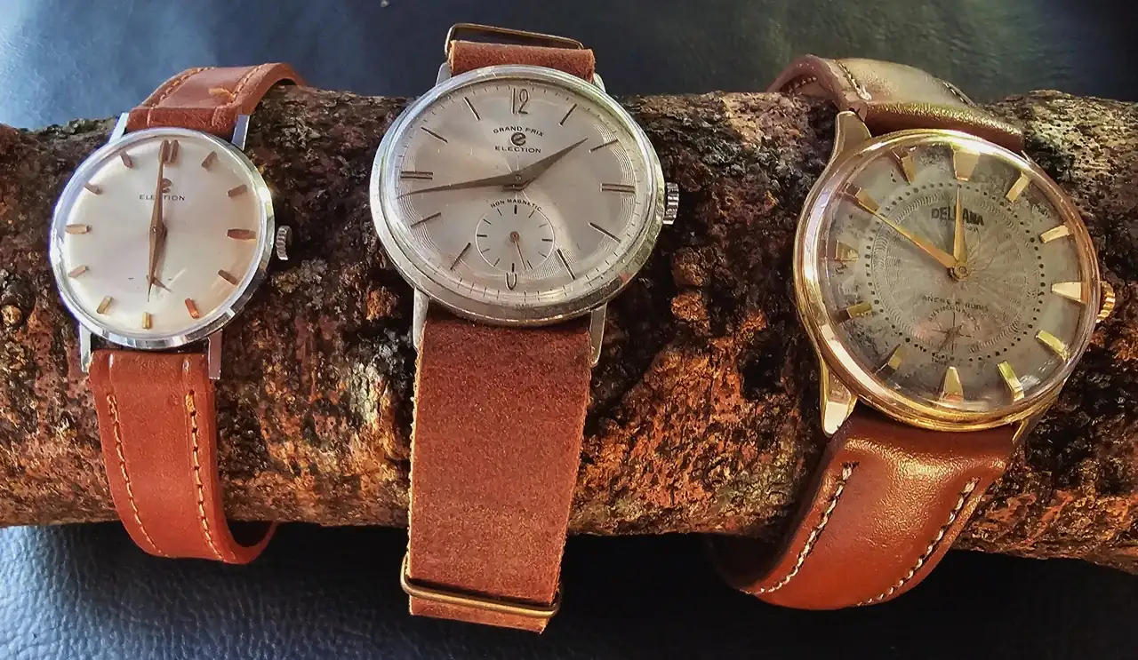 Más suizos: Un pequeño ELECTION (25 mm; el primer reloj que compré yo mismo, me enamoró a mis 18 años en la vidriera de un pequeño anticuario, llevo 35 años usándolo), un ELECTION GRAND PRIX (preciosa esfera que justifica foto independiente) y el dorado Delbana (con otra bella y compleja esfera, a la que la imagen no hace justicia).