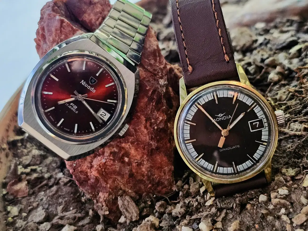 Para terminar con los helvéticos: Un NIVADA F2 (su esfera tornasolada es rojiza con luz natural y marrón con luz artificial; lo compré en un anticuario sin funcionar y hubo que conseguir algún repuesto, pero valió la pena) y un MONDIA GRADUATE de esfera chocolate, que parece recién diseñado.