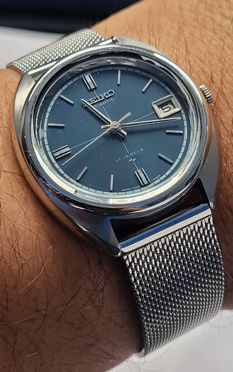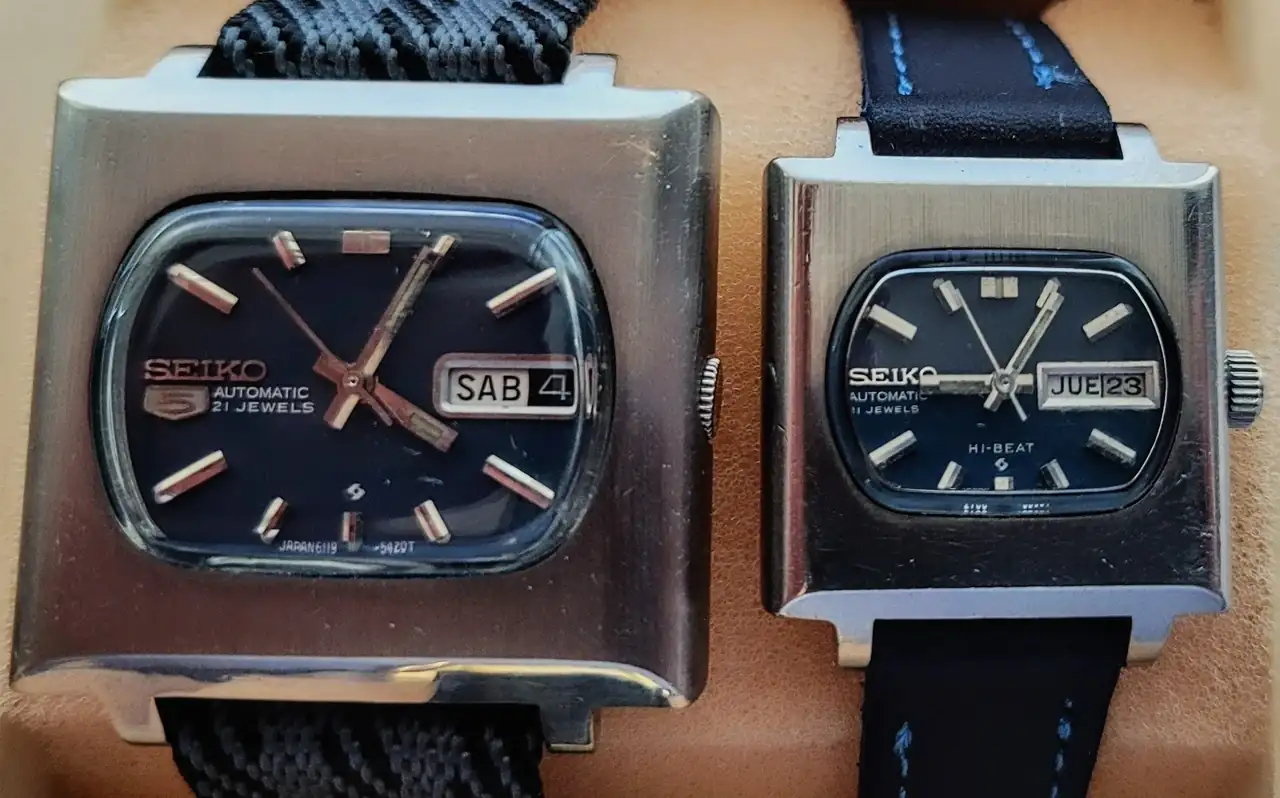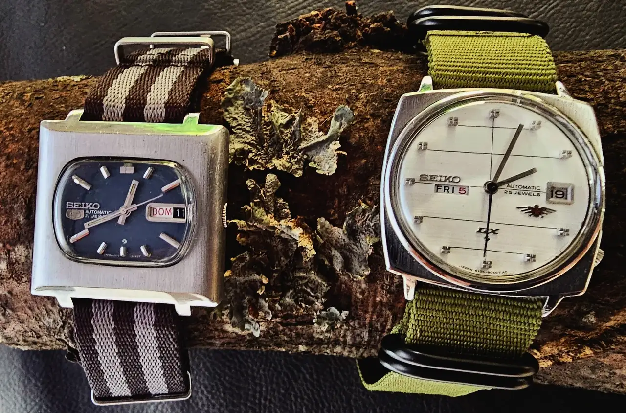 Vamos a los vintage nipones: Tres SEIKO. El ‘5’ (6119-5401) al que llamaban “TV Model” (grita setentismo y el debate es si es o no el SEIKO más feo –a mi me encanta usarlo y, de casualidad, encontré su pareja femenina, maltratada y por 1Є, pero funcionando perfecto después de una simple limpieza y restauración casera-). El bello DX SEALION (M88 – 6106-8030) -siiii, ya se: ¿qué hace el pajarraco de Citizen ahí 😂? Ni idea. Obra de algún alocado relojero. Así lo compré-. El impecable y sencillo SEIKO 7005 (apropiado por mi hija).