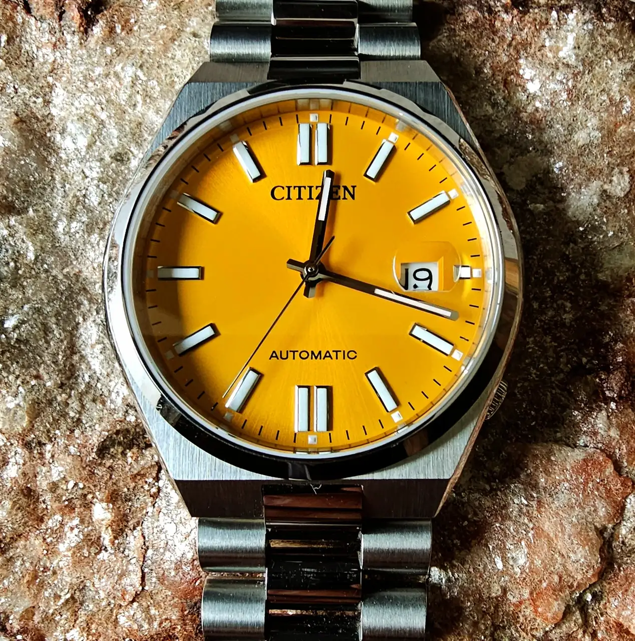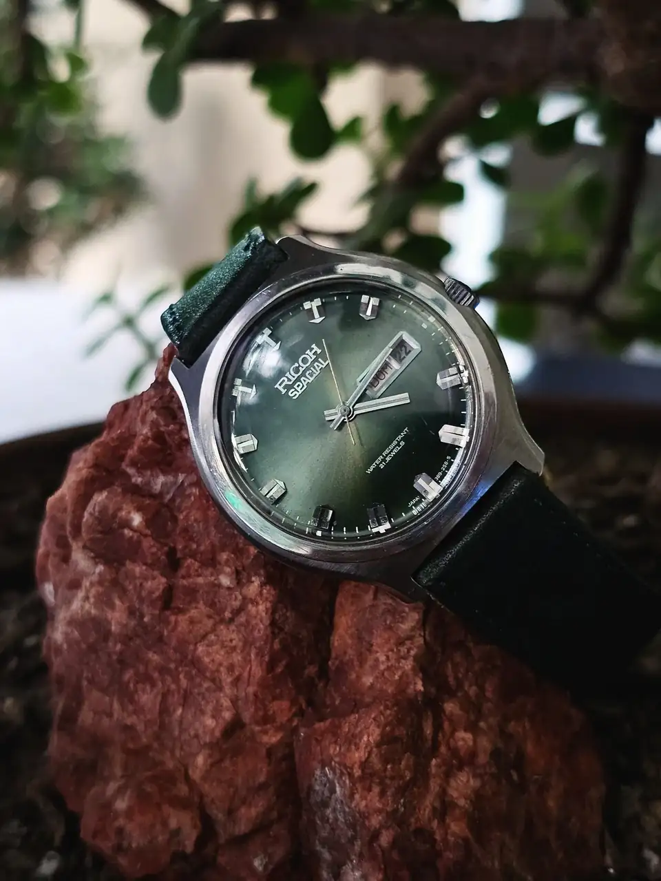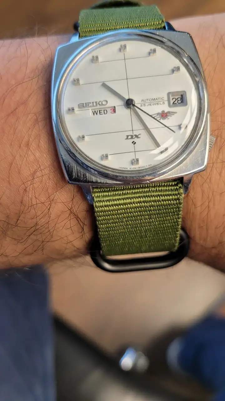 Vamos a los vintage nipones: Tres SEIKO. El ‘5’ (6119-5401) al que llamaban “TV Model” (grita setentismo y el debate es si es o no el SEIKO más feo –a mi me encanta usarlo y, de casualidad, encontré su pareja femenina, maltratada y por 1Є, pero funcionando perfecto después de una simple limpieza y restauración casera-). El bello DX SEALION (M88 – 6106-8030) -siiii, ya se: ¿qué hace el pajarraco de Citizen ahí 😂? Ni idea. Obra de algún alocado relojero. Así lo compré-. El impecable y sencillo SEIKO 7005 (apropiado por mi hija).