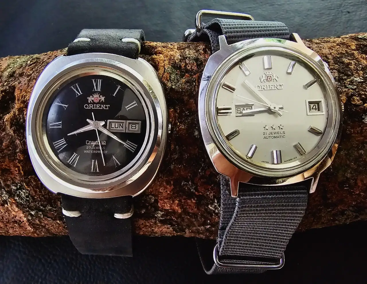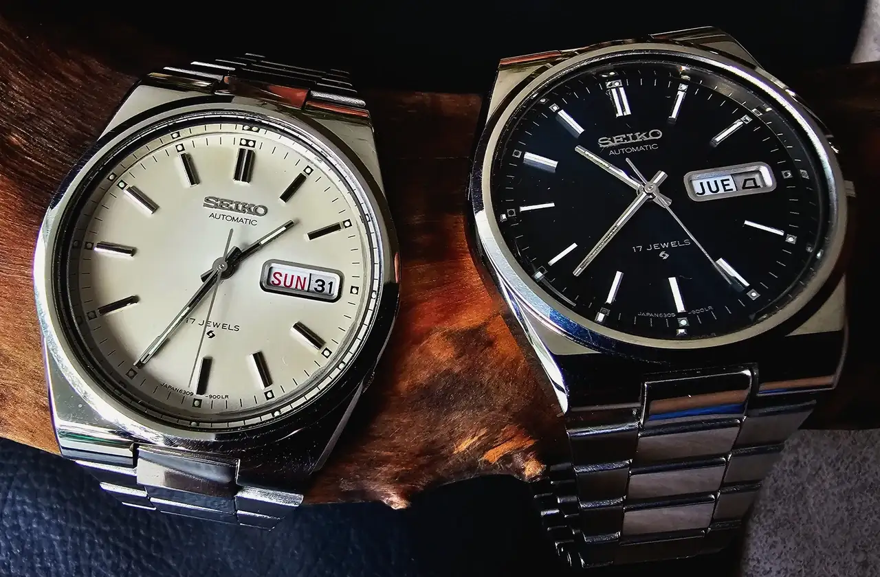 Otros dos Seiko que luchan por ser mis preferidos de toda la ’colección’. Comprados ‘NOS’ a los hijos de un vendedor de relojes que decidieron sacarlos de sus cajas muchos años después de fallecido el padre. En esa ‘orgía’ de relojes vintage –económicos- (va foto de sólo una de las cuatro cajas que me mostraron), encontré los tres ORIENT de más abajo y estas dos bellezas mellizas, con esferas imposibles de fotografiar dignamente, una color crema degradé cambiante (6309-9000) y otra de un azul profundo y tornasolado que sólo se puede disfrutar en toda su magnitud en vivo (6309-9009). Cansado de intentar decidirme por uno de ellos..., compré los dos.