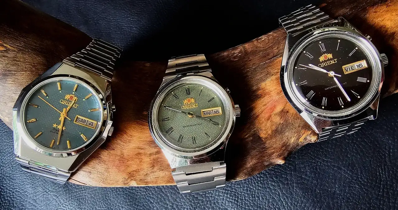 De aquellas cajas ‘NOS’ salieron también estos tres ORIENT. La esfera del marrón es otra hermosura imposible de mostrar en fotos (o por lo menos en torpes fotos de móvil). El vistoso celeste es el único automático.
