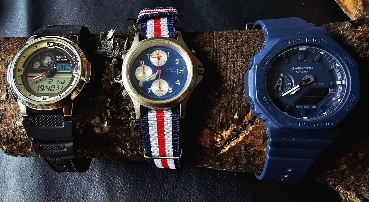 Salimos de los vintage con un hermoso CASIO Thermometer, con mi G-SHOCK de batalla (GMA-S2100BA) y con el único reloj que pude recuperar de mi infancia –fatalmente, ese sólo dato lo hace vintage- (mi padre me regaló varios siendo niño, que se esfumaron en el tiempo). Funciona a la perfección.