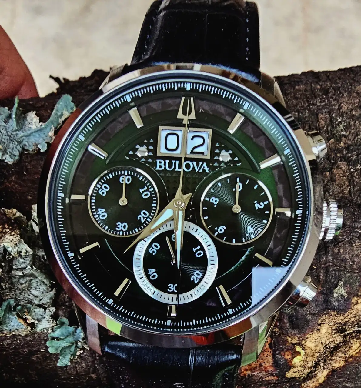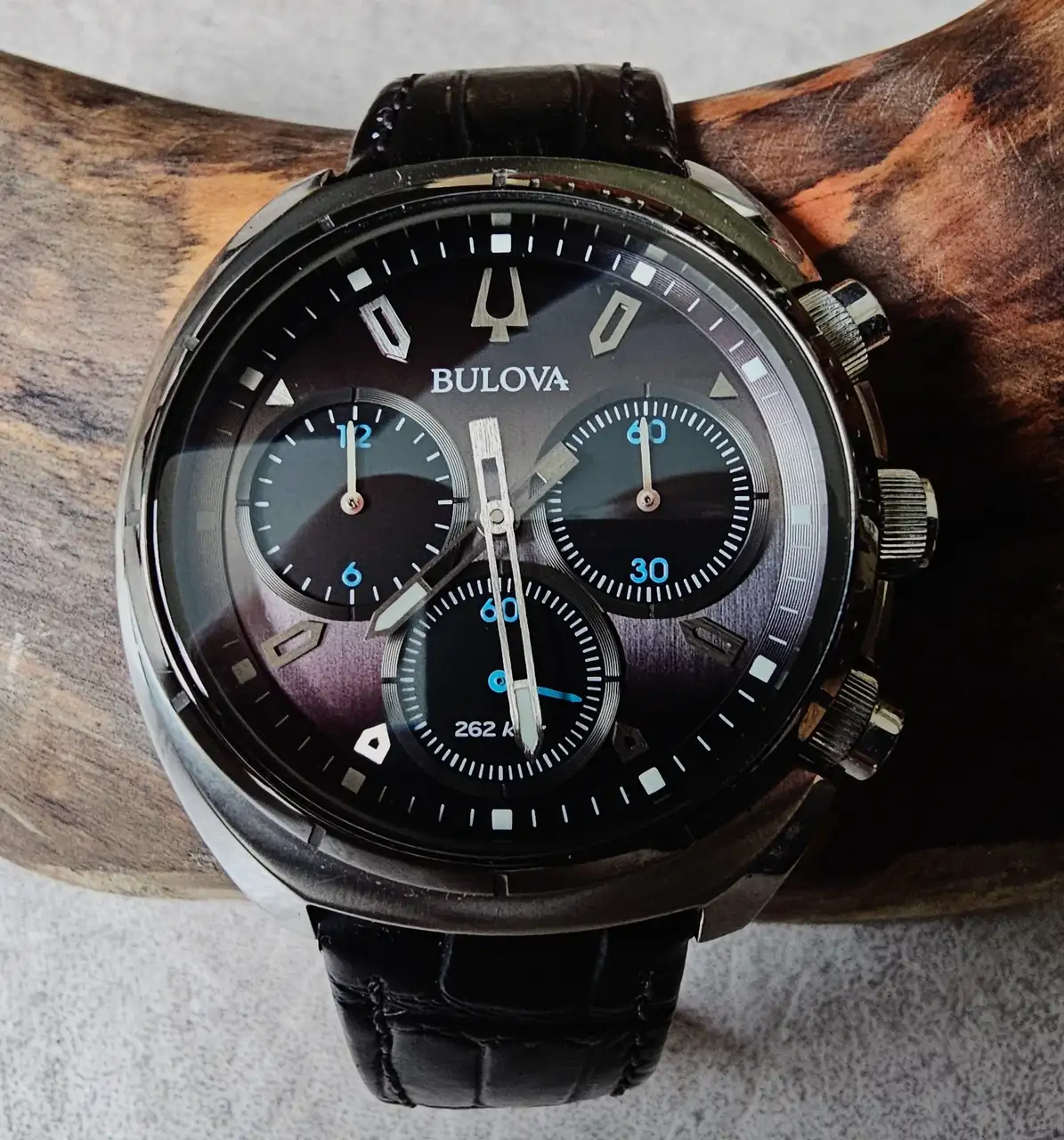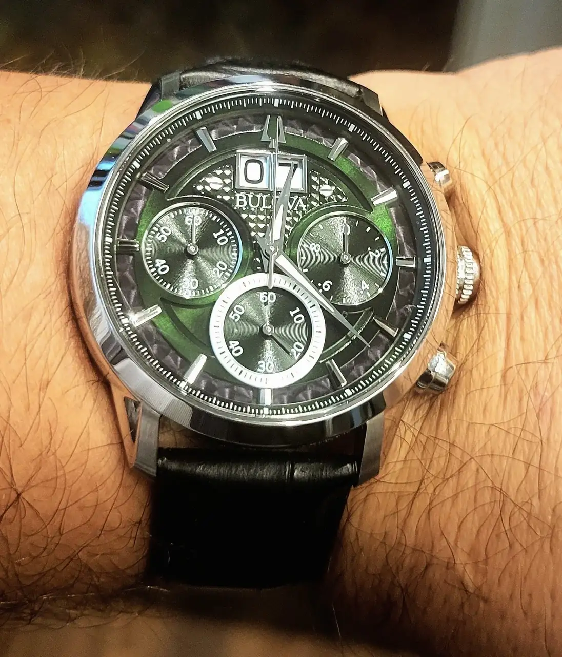 Dos BULOVA. Mi adorado verde (96B310), que fue el primer no-vintage que compré al renacer mi pasión orológica. El CURV (98A155) buscado mucho tiempo y recién ingresado (su caja -y movimiento- curvo lo transforma en un delgado guante de muñeca).