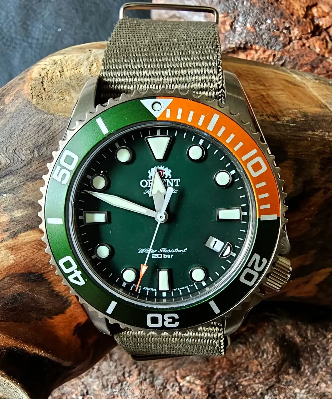 El precioso ORIENT NEW TRITÓN, y su imbatible combinación verde/naranja en caja de acero color bronce.