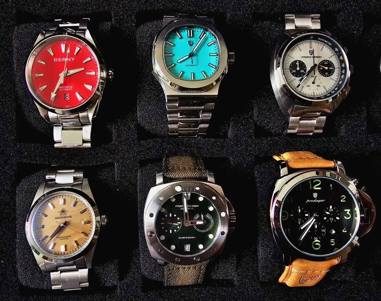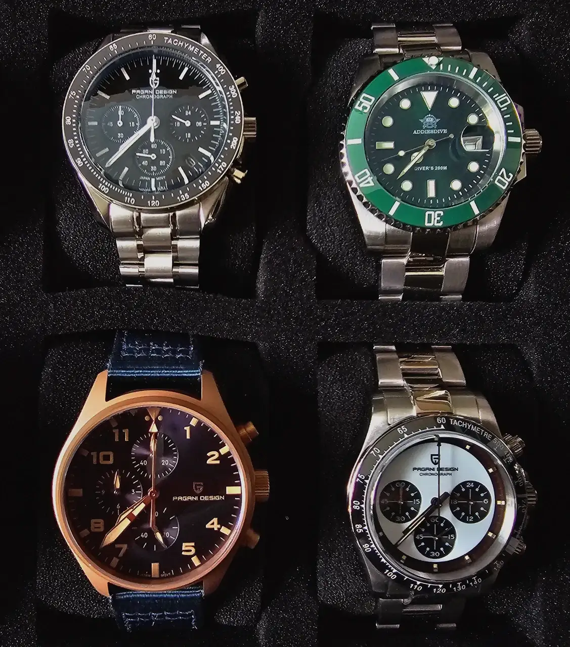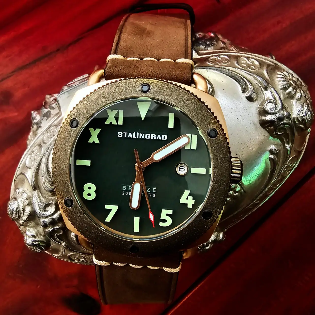 Ahora, sólo toma panorámica de mis chinos. La discusión sobre ellos es estéril y cansa. Muchos homenajes (ninguna copia, jamás) de relojes que nunca voy a poder comprar (Nautilus Tiffani, Daytona, etc.) o estar dispuesto a hacerlo con mi actual presupuesto (Hulk, Luminor, IWC, etc.). Si quieren, pueden considerarlos ‘bijouterie orológica’. Son hermosos, muy bien construidos, funcionan perfecto –gracias a sus básicos y fiables movimientos japoneses- y disfruto ver su estética en mi muñeca (y todos ellos, sumados, cuestan menos que un armis original de alguno de los arriba nombrados –por lo que no dolerá romperlos o perderlos-). Agrego por separado un STALINGRAD que recibí hoy, y es mi primer bronce.