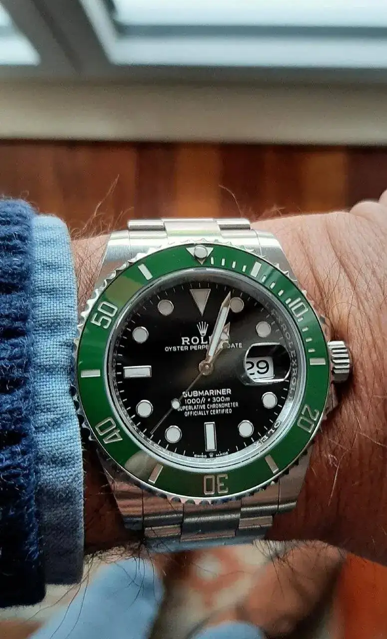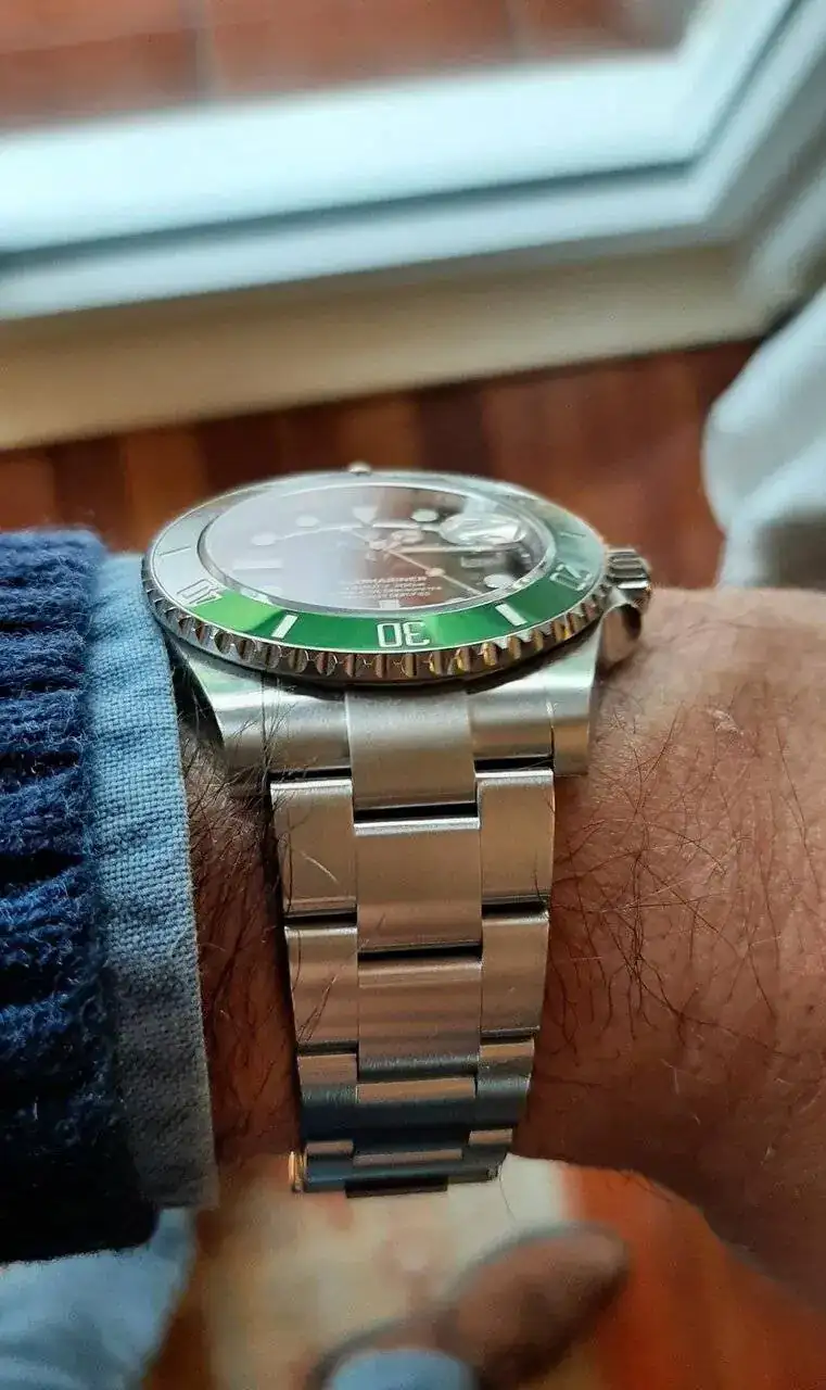 Así que estamos muy contentos. Os dejo unas fotos bastante malas que no le hacen justicia a esta belleza. El bisel “Aniversario” es espectacular y camaleónico, y según como le incida la luz, se parece al color del bisel de aluminio del Kermit, lo cual me encanta.