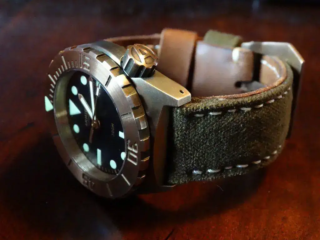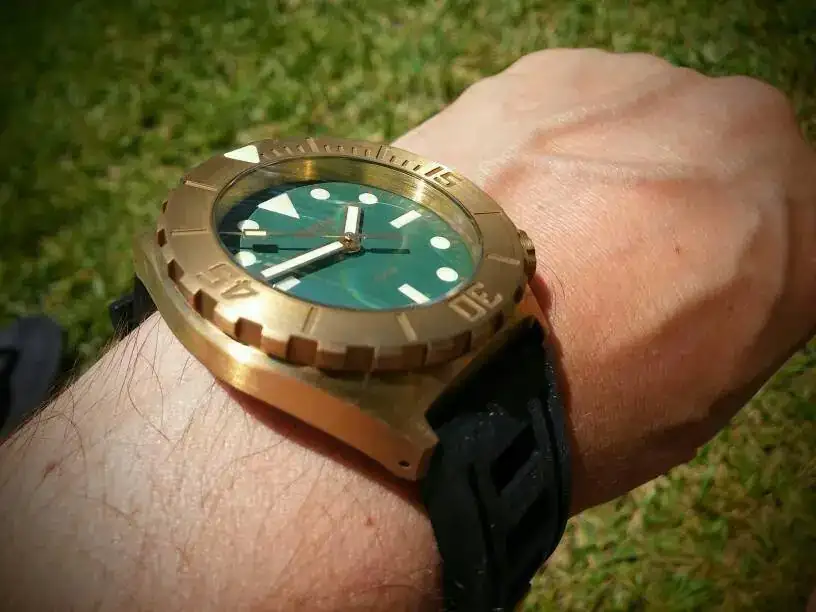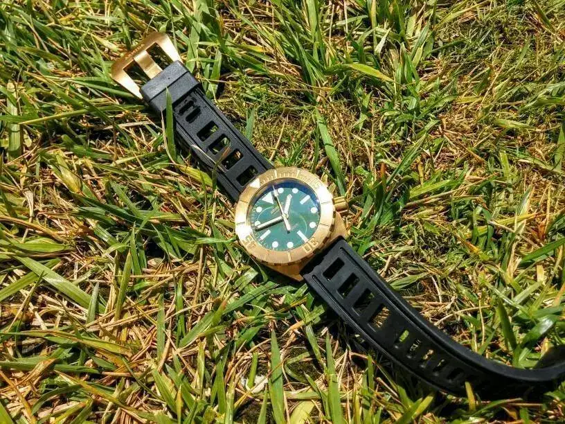Tamaño contenido, pero a la vez contundente. Ayuda, seguramente, el enorme buckle firmado, tipo Panerai, que acompaña a la correa de caucho, de muy buena cálida diría yo. Gruesa, flexible, cómoda... Perfecta, aunque un poco larga para mí escuálida muñeca. El dial es perfectamente legible y el lumen es extraordinario. Mención aparte para el zafiro doble domed... Espectacular. A ver si puedo y le hago más fotos por si alguien está en duda como yo lo estaba.