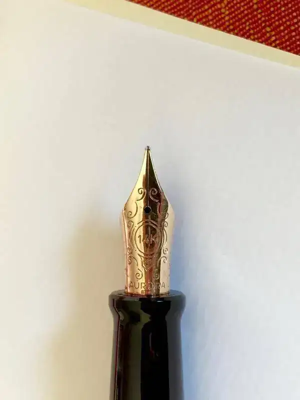 Viene armada con un precioso plumín puntiagudo (tengo que consultar el Reglamento de Armas, no sea que puedan considerarlo un arma blanca), en el que está grabado el nombre de la marca y la clase de oro empleado para su fabricación.