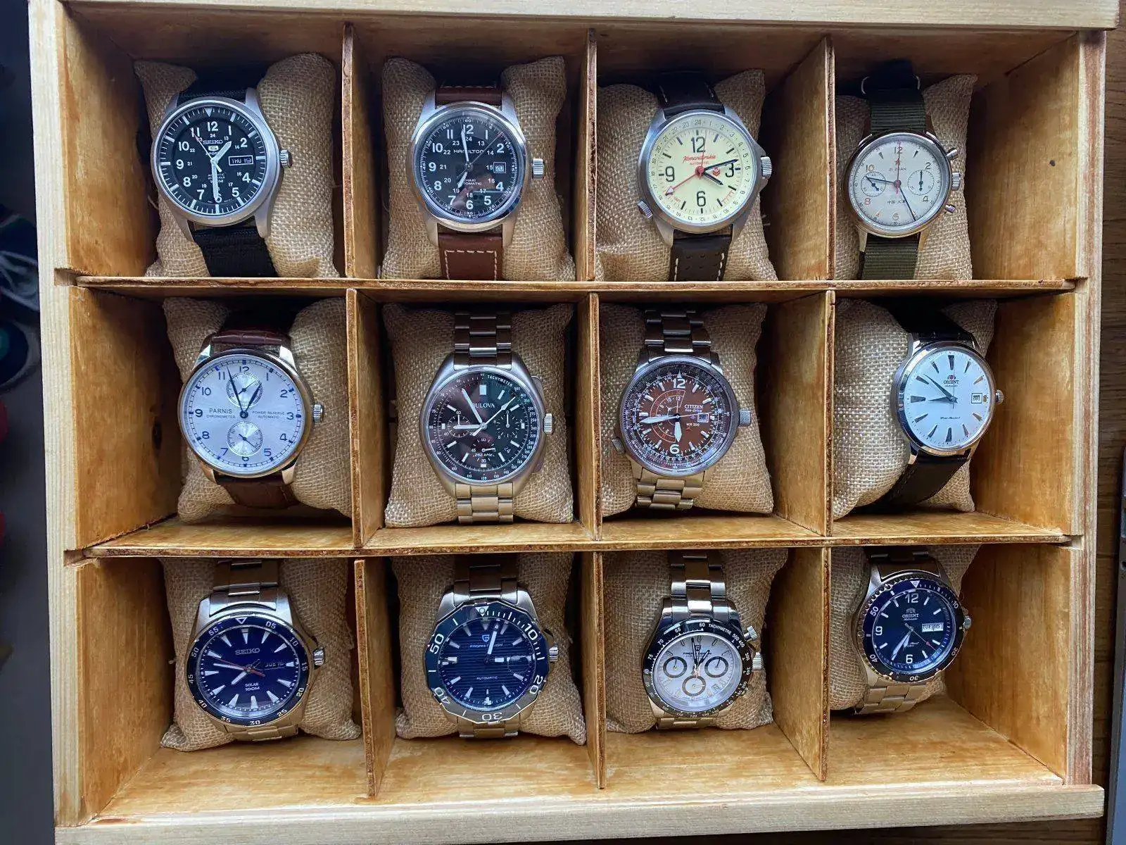 Muchas gracias! Pues la caja tiene su historia, no lo comenté y puede que sorprenda pero es un estuche de botellas de vino convertido artesanalmente en caja de relojes como regalo. Así que no puedo estar más contento y orgulloso de la caja.Me gusta la caja, especialmente el Bulova y el Hami y la caja (la caja física) también está genial