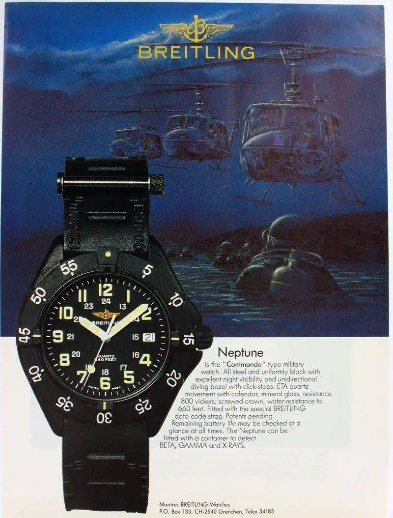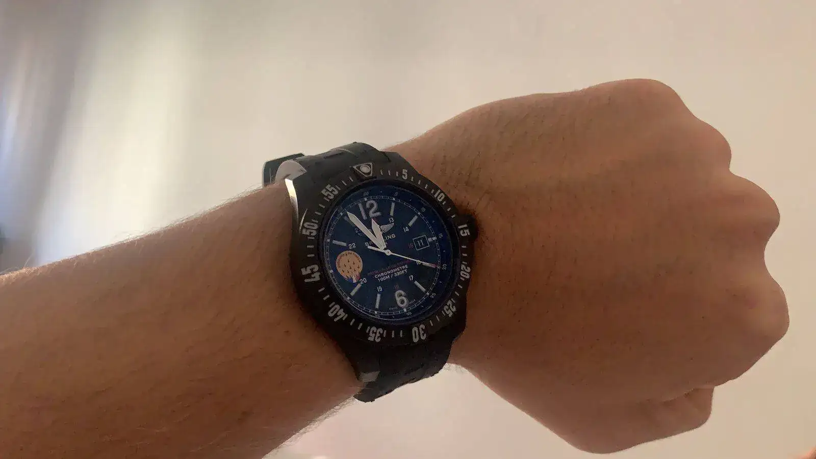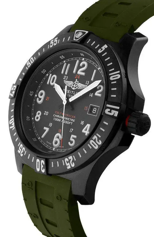 Es un reloj con muchos detractores porque es un súper quartz (mi primer cuarzo creo), con un material que ha fabricado Breitling llamado Breitlight, que es un material que Breitling presentó en 2016, con el Avenger Hurricane. Es un polímero patentado, de marca registrada, que la marca dice que es 3.3 veces más liviano que el titanio, o la friolera de 5.8 veces más liviano que el acero, pero más duro que ambos.