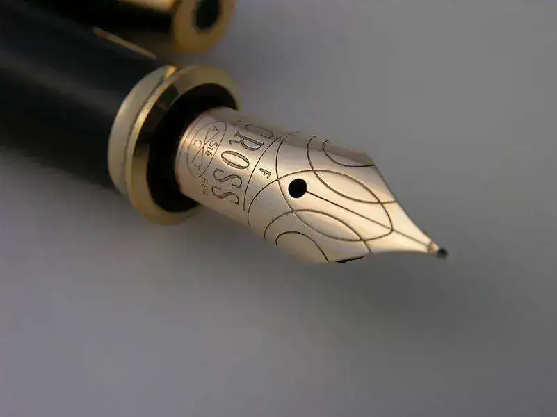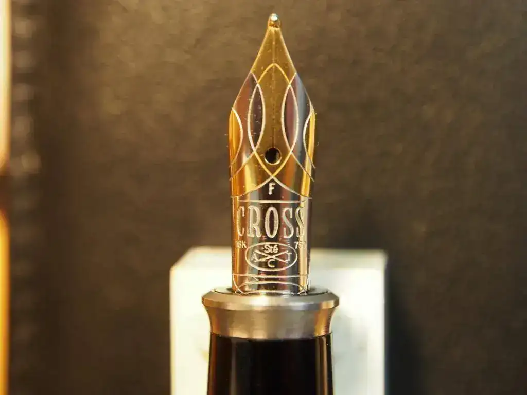 El plumín es de 14K de trazo F, monotono y escribe muy suave y jugoso, aunque es bastante rígido. Visto en detalle, a mi me resulta extraordinariamente parecido a los que monta Pelikan en su gama media (M400 y M600). El perfil es el mismo, el corte es igual y el alimentador es idéntico salvo por una hendidura central extra en la Cross. Sin embargo, me parecen más flexibles los Pelikan que este de Cross. Podrían ser fabricados por Bock en ambos casos, lo cual no resulta extraño. Se sabe que muchos de los plumines de los modelos actuales Cross son de origen japonés, a cargo de Pilot, según parece.