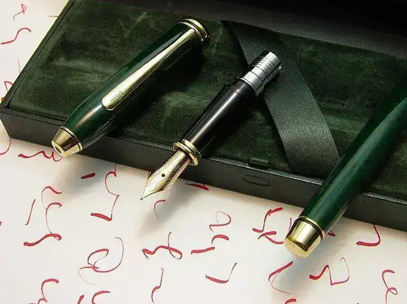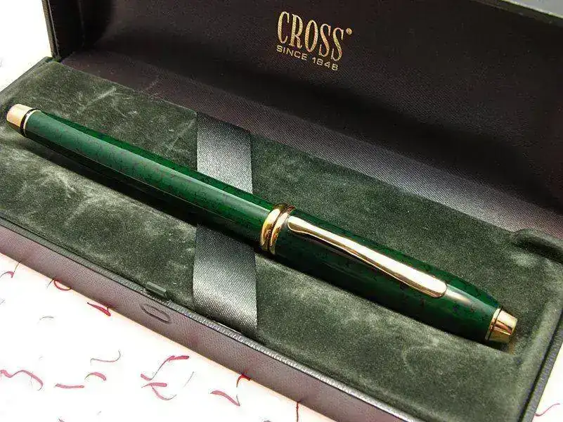 Tengo el placer de presentar la primera pluma de la marca Cross que he decidido adquirir. Se trata de una versión de la serie Townsend en laca verde marmoleada de un color malaquita muy bello y cuya referencia según figura en la caja, también verde, es 807-3 F GRN. Todos los detalles metálicos del modelo están chapados en oro.