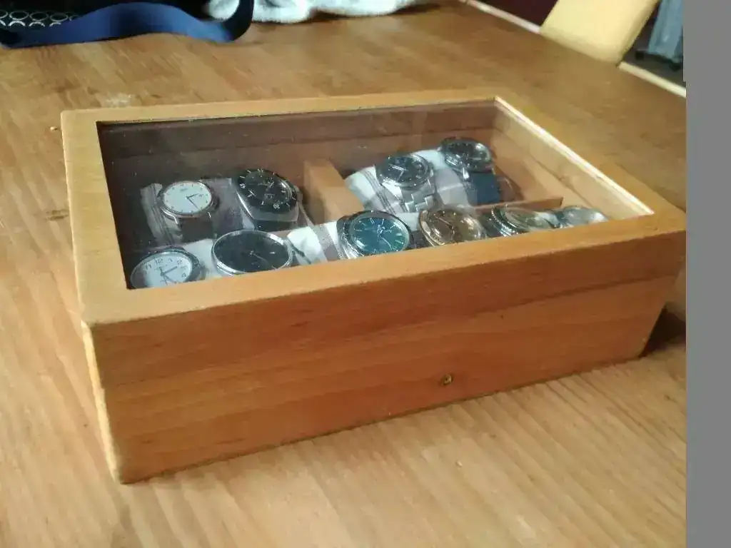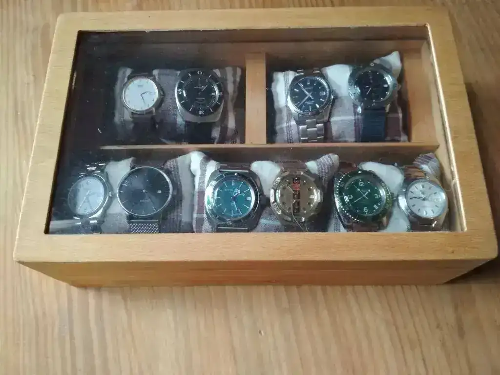 mi problemilla ahora es que ya veis que la caja ya no da para mas. Tengo 10 espacios , tengo 11 relojes. Como uno lo llevo puesto , pues voy tirando, pero es que me va a llegar uno nuevo, un Tempore lux con seiko NE15 , un diver de una micromarca española financiada por kickstarter y deberia decidirme por deshacerme de alguno. Pero es que le tengo cariño a todos, algunos por su historia detras aunque ya no me los ponga, los demas simplemente porque me gustan.