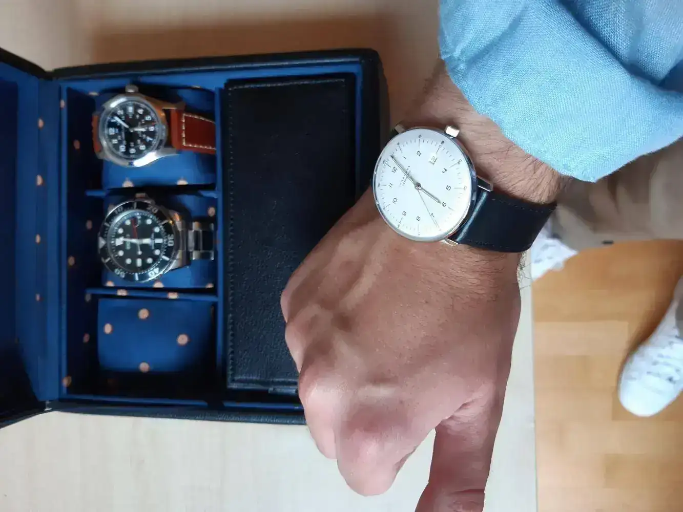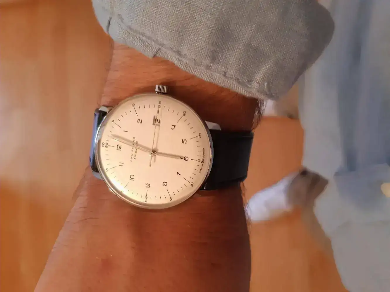 Así pues cuando varios de vosotros me contasteis maravillas de Junghans empecé a enamorarme de ellos y, siguiendo enamorado al cabo de varios días, he visto que tenía que ir a por él. Y encantado es poco amigos. Sobriedad, elegancia, personalidad, racional, minimalista, europeo...no puedo pedir nada más.