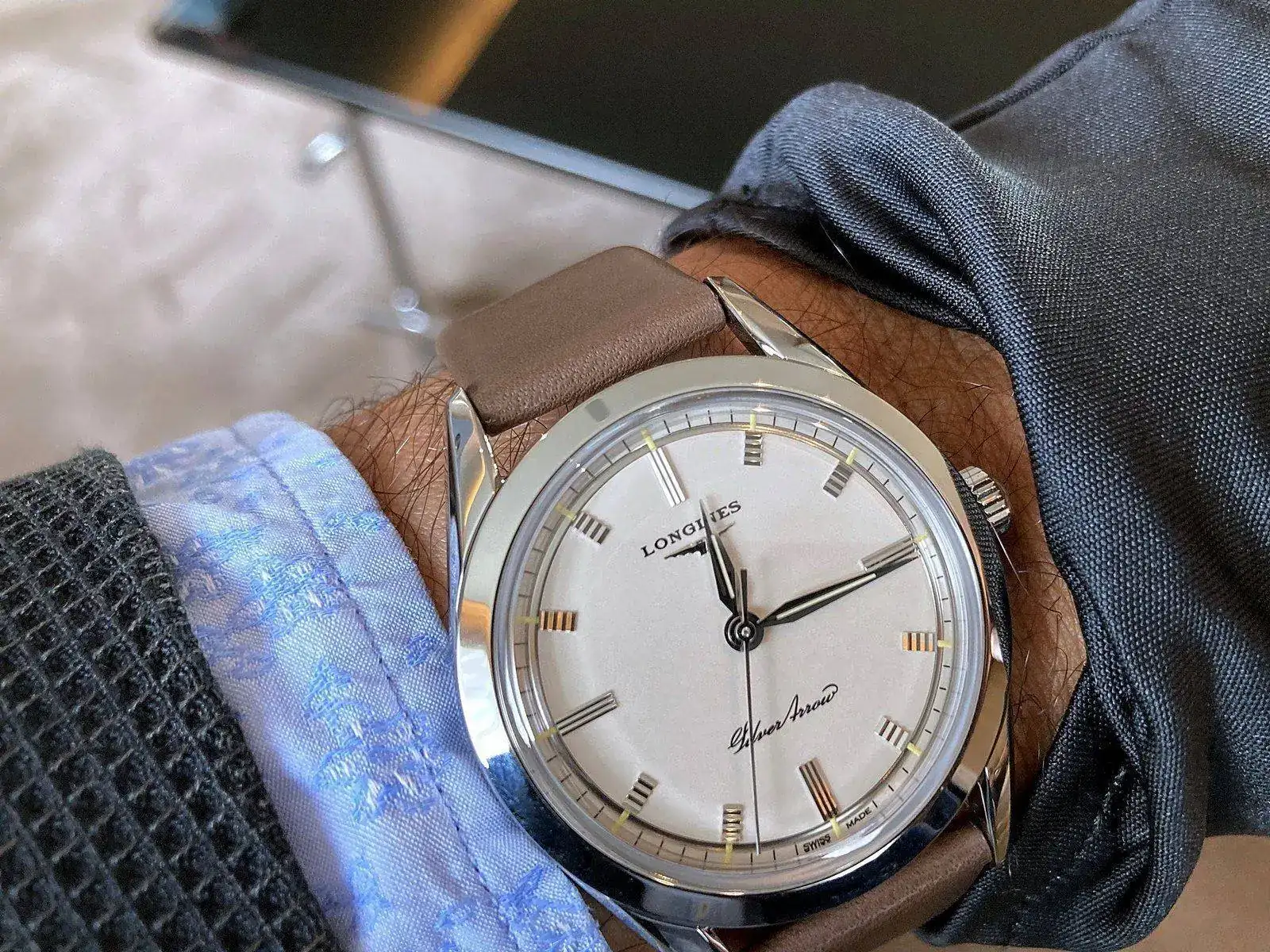 me gustó mucho también (soy facilón con los neo-vintages, lo admito) La historia del Silver Arrow se remonta a 1955, cuando la marca organizó un concurso interno para encontrar el nombre de un nuevo reloj con un diseño de vanguardia. De las 450 propuestas salió vencedora Silver Arrow, una referencia a los coches deportivos de Mercedes (los 300 SLR) que dominaban los circuitos de carreras de la época. Longines lanzó el primer Silver Arrow en 1956... un nombre ahora lastrado por el terrorífico accidente ocurrido un año antes en Le Mans, donde perdieron la vida el piloto de un Silver Arrow y nada menos que 83 espectadores. Fangio se salvó por los pelos, por cierto.
