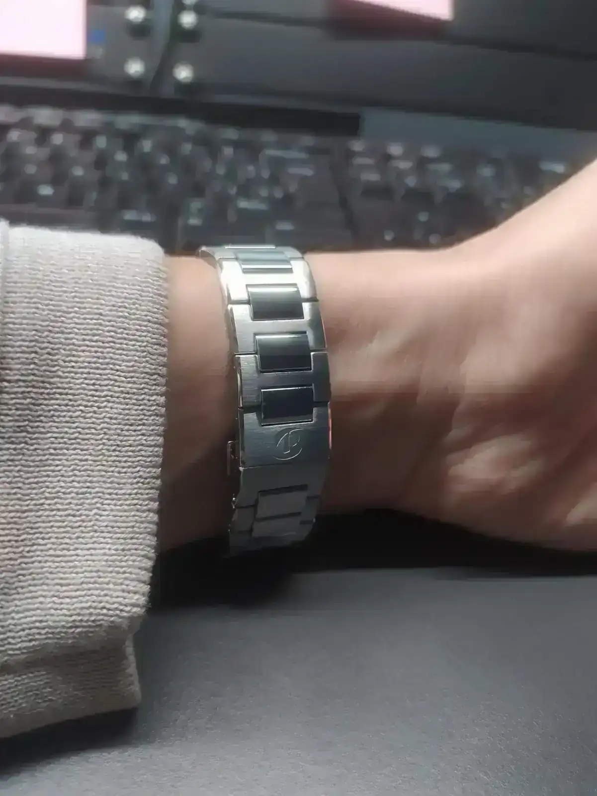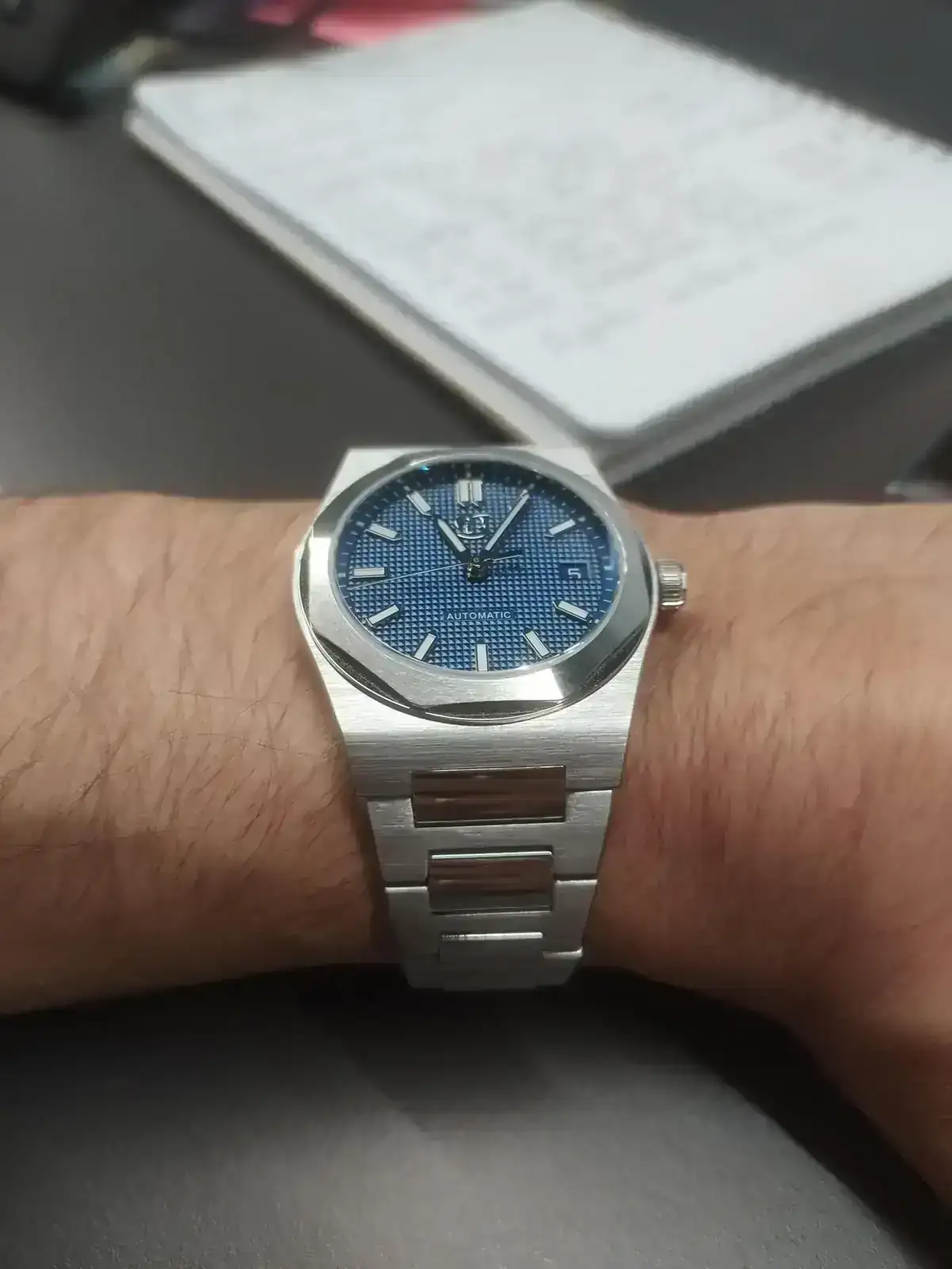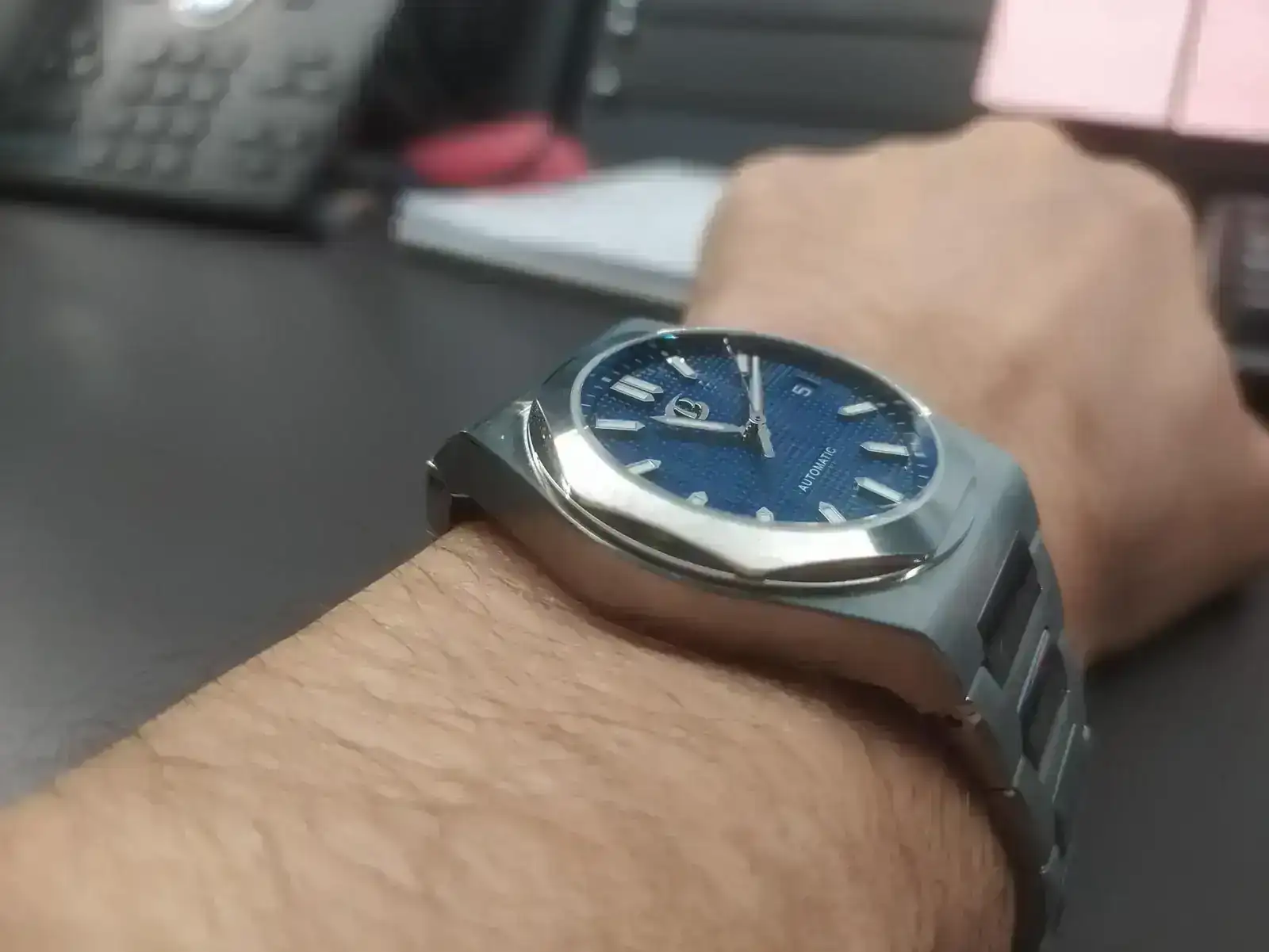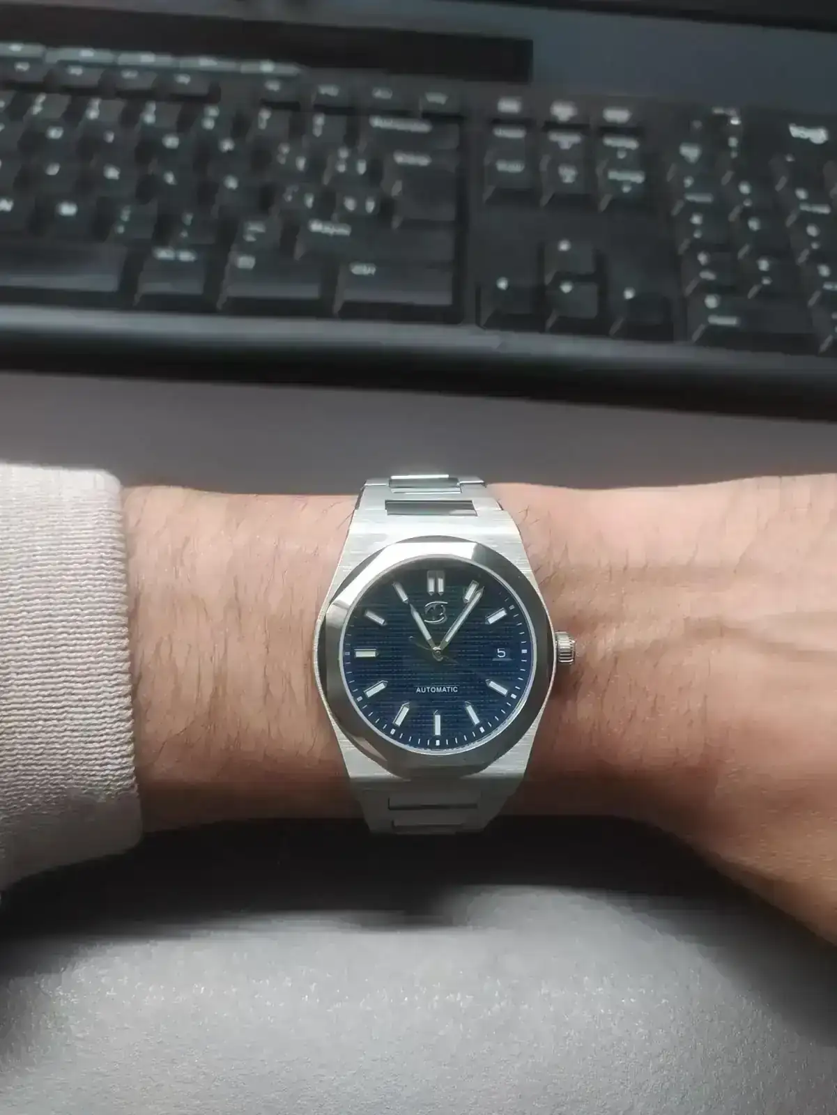 , ademas estaba a relativamente buen precio, por lo menos comparado con el cronos. Me ha gustado bastante, la calidad se ve muy bien en general, tiene alguna cosilla pero vamos, en general muy contento y satisface mi impulso de este tipo de reloj. Es una V2, la version anterior tenia 40mm de caja y este tiene 38,5mm, es un tamaño mas contenido pero a mi muñeca de 17mm le queda bien, es el reloj mas pequeño que tengo pero la distancia entre asas lo hace resaltar igualmente.