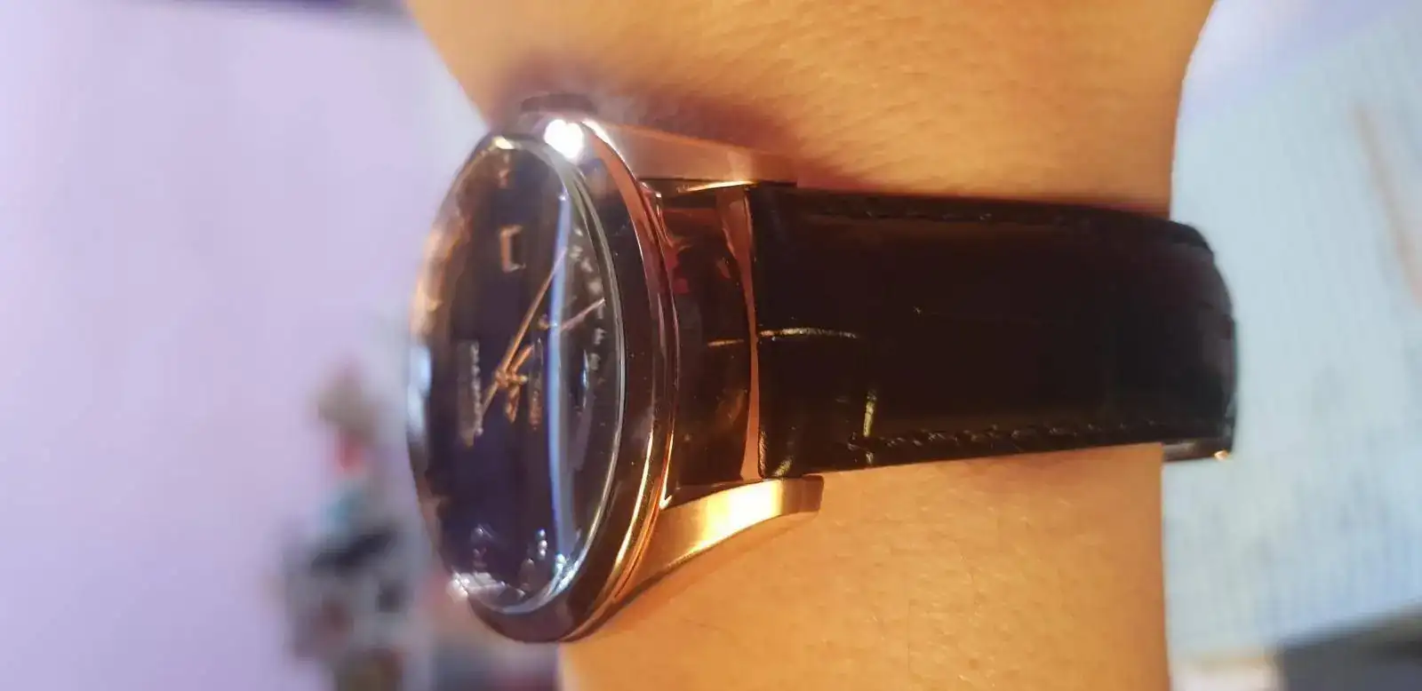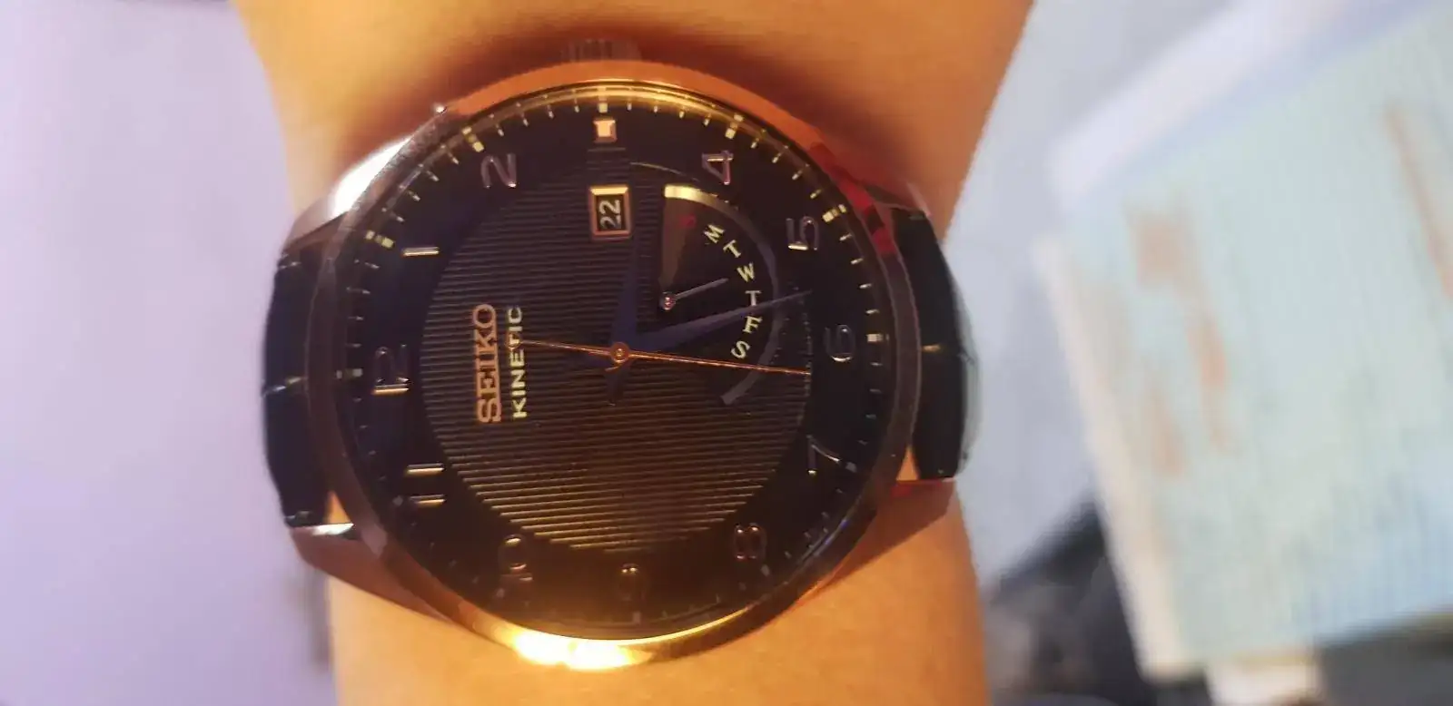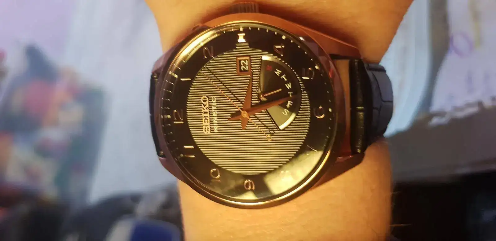 En buen precio adquiri un Seiko Kinetic srn054, bestial hermosura. Caja con un detalle de oro rosa, fondo negro, correa de cuero negro con detalle cocodrilo.