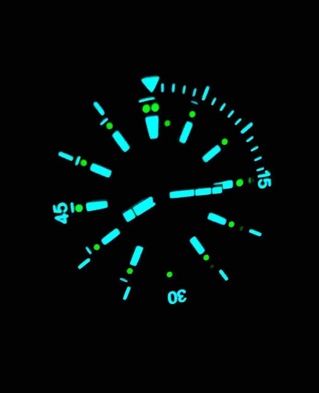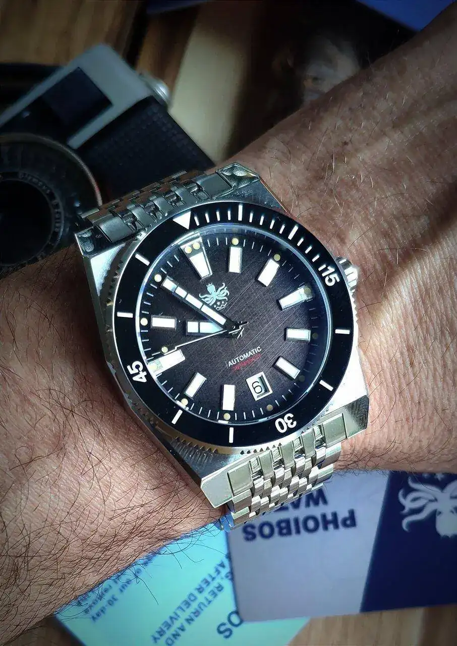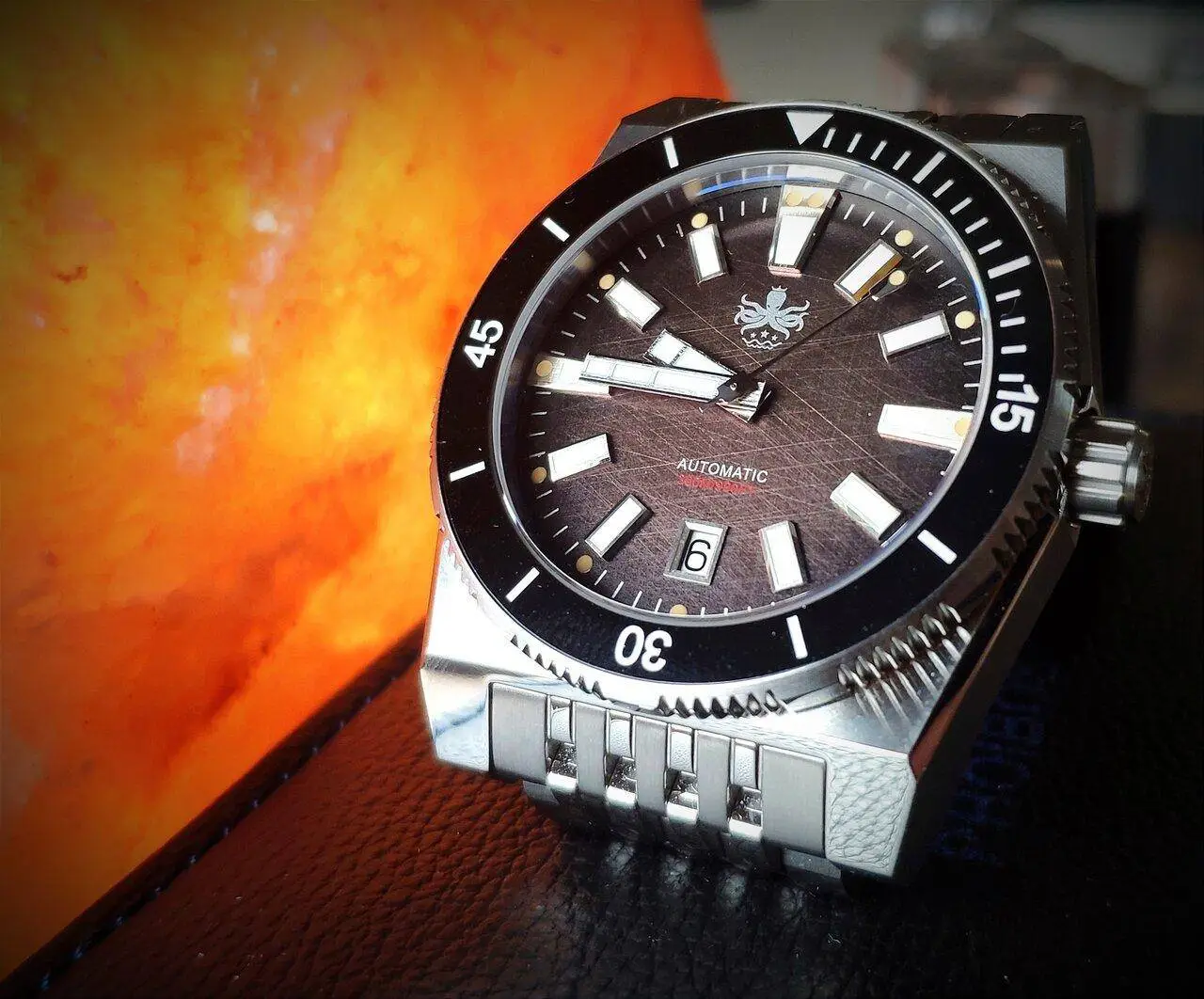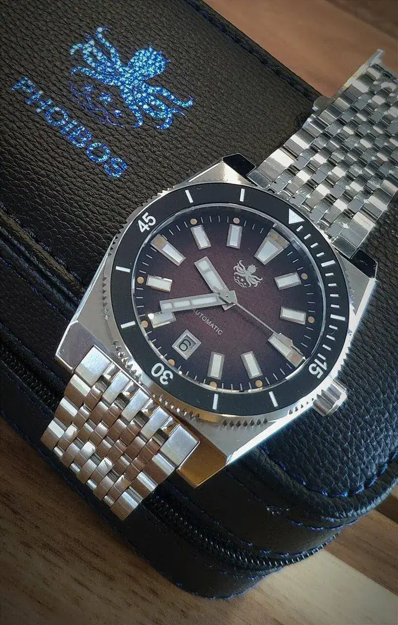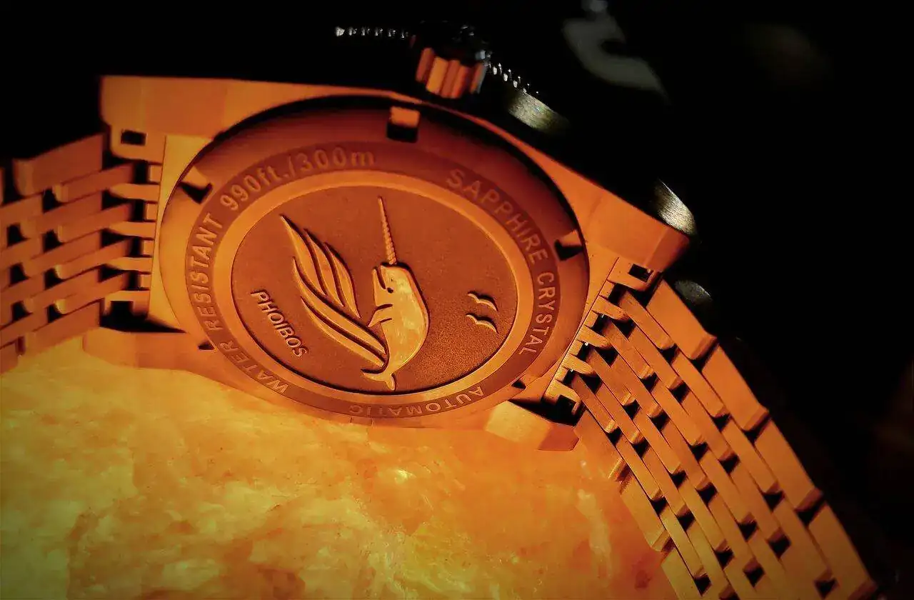 La pieza en cuestión forma parte de la micro marca Phoibos, concretamente el modelo Narwhal. Es un reloj de buceo con caja tipo vintage, muy angulosa y “cortante”, pero con un claro acento moderno y provocativo. La marca define sus diseños con la siguiente frase:
