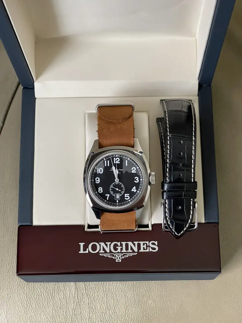 Total en un estire y afloje llegué a la conclusión que quería ese reloj más que nada en el mundo aun que solo tuviera la caja.Ver el archivos adjunto 2889505Ver el archivos adjunto 2889506Ver el archivos adjunto 2889507Ver el archivos adjunto 2889508Longines Heritage 1935 Pilot Majetek edición limitada es te es un reloj que me voló la cabeza, viene originalmente con esa correa de piel negra pero por ser militar le puse esa NATO de piel cafe clara y creo por ser un reloj militar se le ve muy bien.