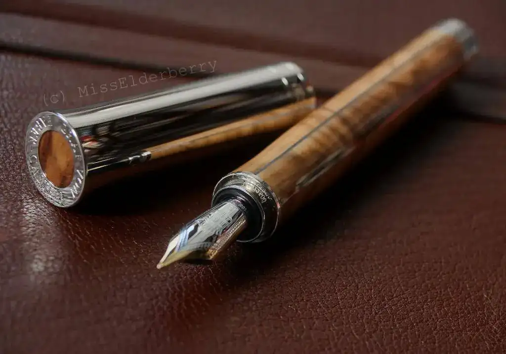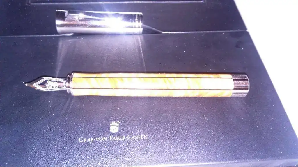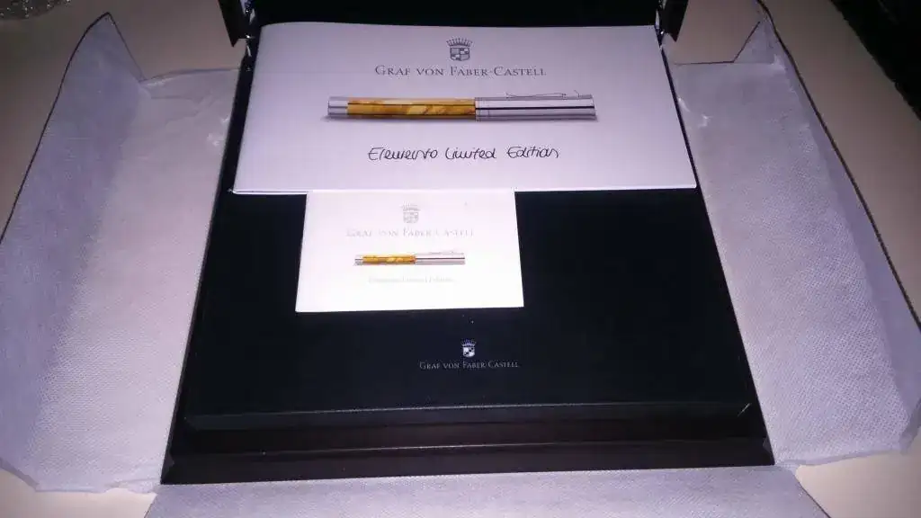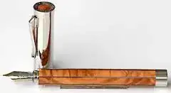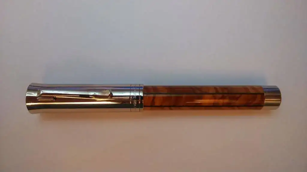 Por algún motivo que desconozco, Graf Von Faber Castell no es tan popular como otras marcas dedicadas al producto de calidad. Y sin embargo, para mí son unas predilectas absolutas. Hoy voy a presentar, con la mala calidad fotográfica a que acostumbro, una estilográfica realmente excepcional. Se hizo con motivo de los 250 años de la casa, y copio casi literalmente los comentarios del propio fabricante "La colección Graf Von Faber Castell ha celebrado el 250 aniversario de la marca Faber Castell con una edición limitada muy especial. Con cuerpo en madera de olivo profusamente veteada... El uso de una innovadora técnica permite descubrir un singular veteado desconocido hasta la fecha. Como una obra maestra de marquetería, el cuerpo está formado por seis segmentos de madera sometidos a un reiterado proceso de lacado y pulido. Sólo de esta forma se extraen las sorprendentes vetas y originales matices de la madera en tonalidades que oscilan del color marrón rojizo al miel dorado..."