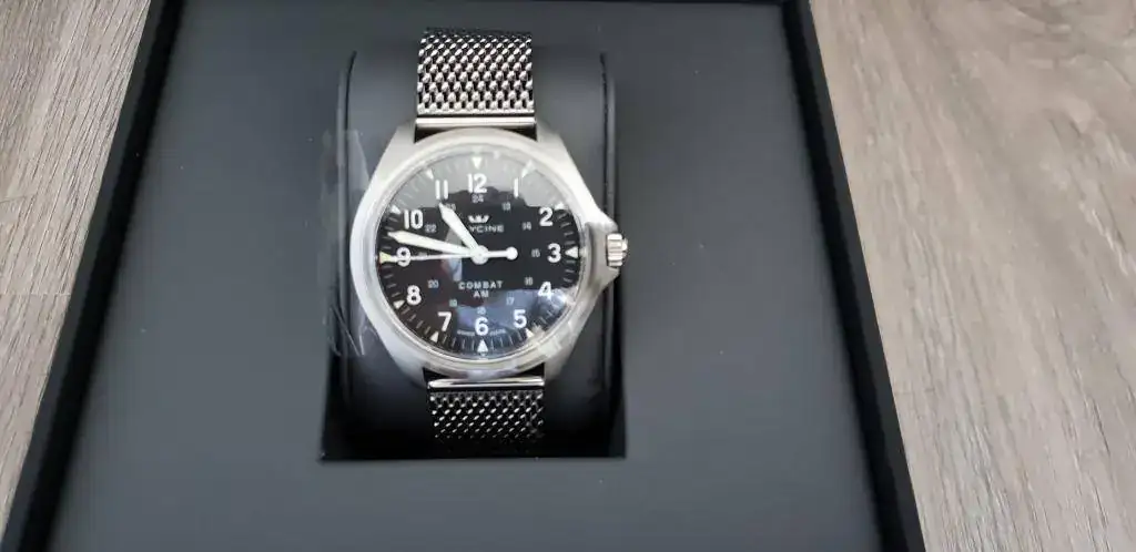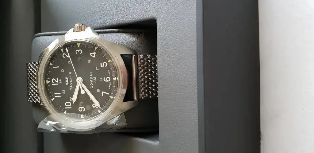 Glycine Combat Vintage 7. Unos 41mm y una distancia de asas de unos 47 mas que aceptables para mi minúscula muñeca de apenas 16cm. Creo que es un reloj bastante fiel a lo relojes tipo militar. Si no estoy equivocado Hamilton ha sacado también los field sin fechador lo cual creo que es un acierto.