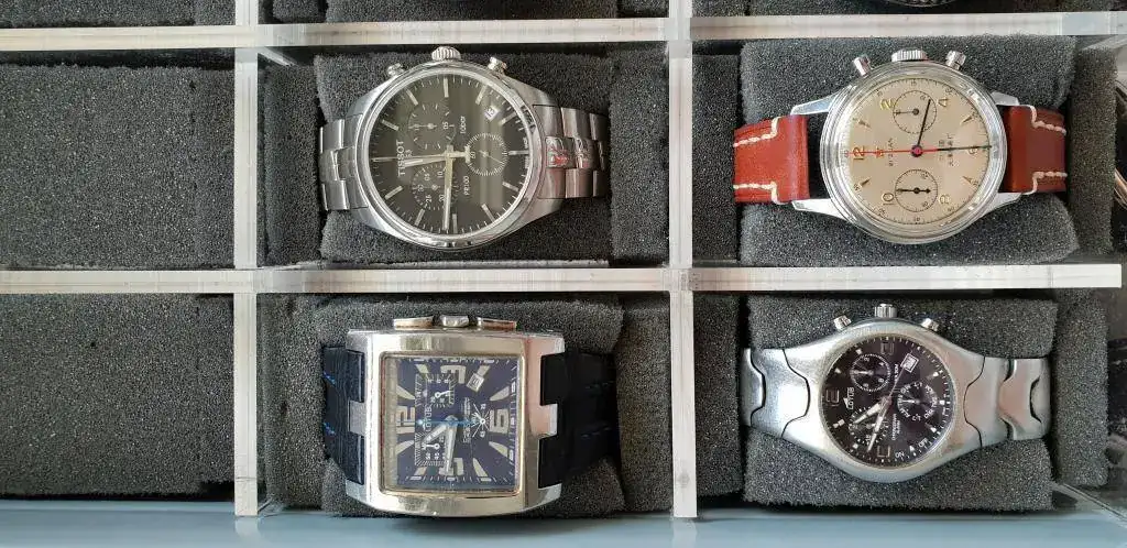 Abajo a la izquierda esta mi primer reloj "bueno" comprado hace 25 años con lo que me dio mi abuela de cumpleaños y completando lo que faltaba con algo que tenia yo ahorrado. Durante muchos años mi reloj. Un Lotus crono con doble uso horario y doble alarma. 25 años después falla a la hora de resetear y después de una caída se desplazaron los puntos de "cero" y un poco el fechador por lo que ya no aparece centrado. Eso si la marcha horaria perfecta.