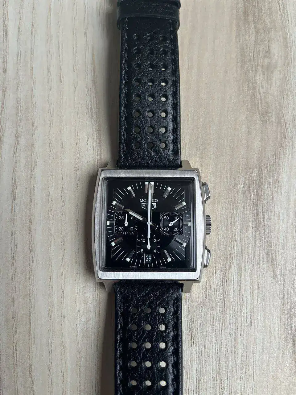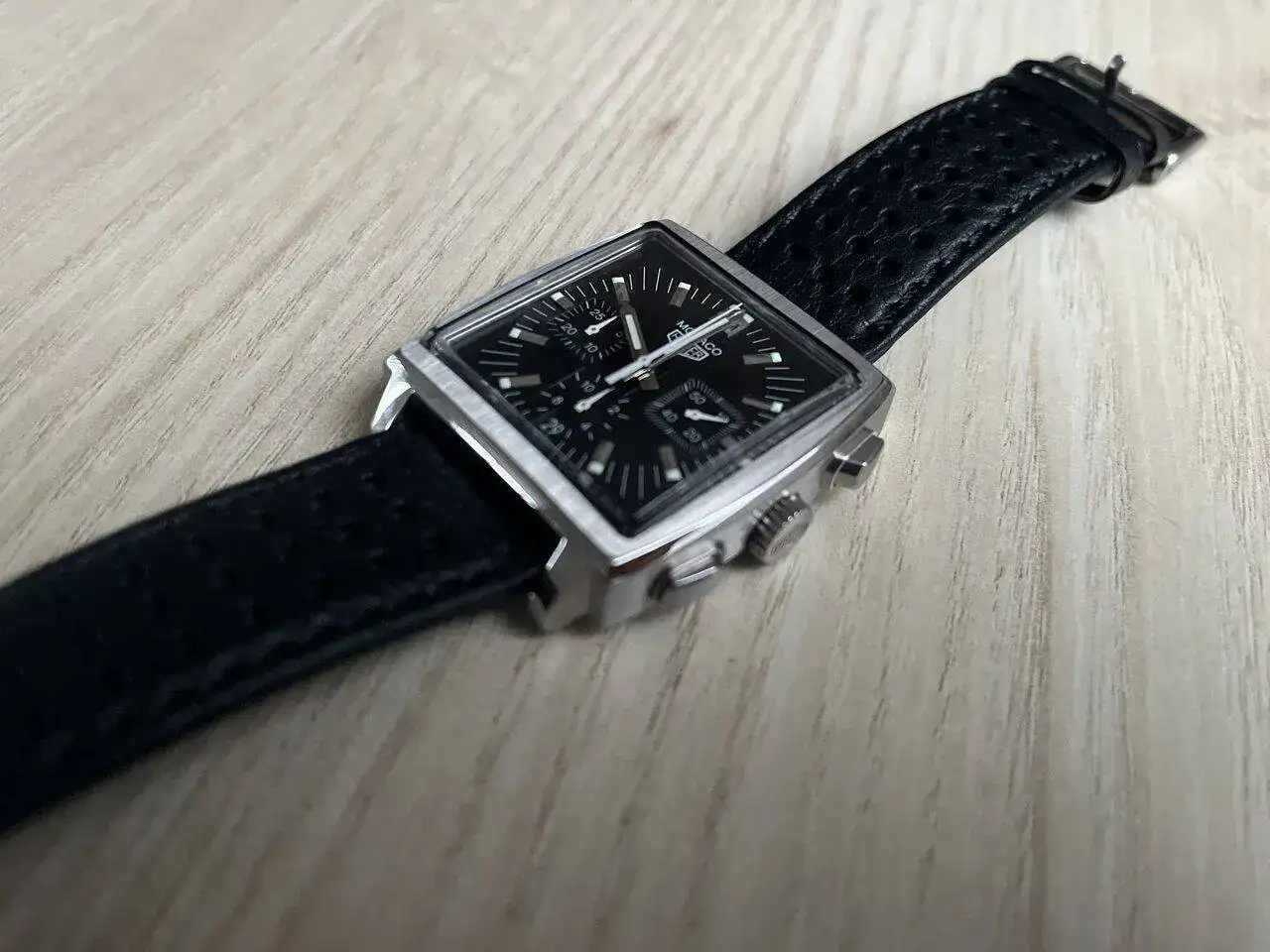 En cuanto a comodidad, como dije en otro foro, el Mónaco maximiza un defecto de los cierres desplegables y es que el reloj busca su posición una vez la mariposa asienta en la muñeca. El reloj ya no se mueve, pero no lo puedes centrar. En un reloj redondo, esto no es tanto problema, pero en uno cuadrado se nota mucho más (y a veces creo que se confunde con ser cabezón, que no lo es) me parece mucho más interesante un cierre de hebilla, que deja el reloj en el centro de la muñeca, y no se mueve más. Además, el plexiglás le da una ligereza que le viene muy bien.