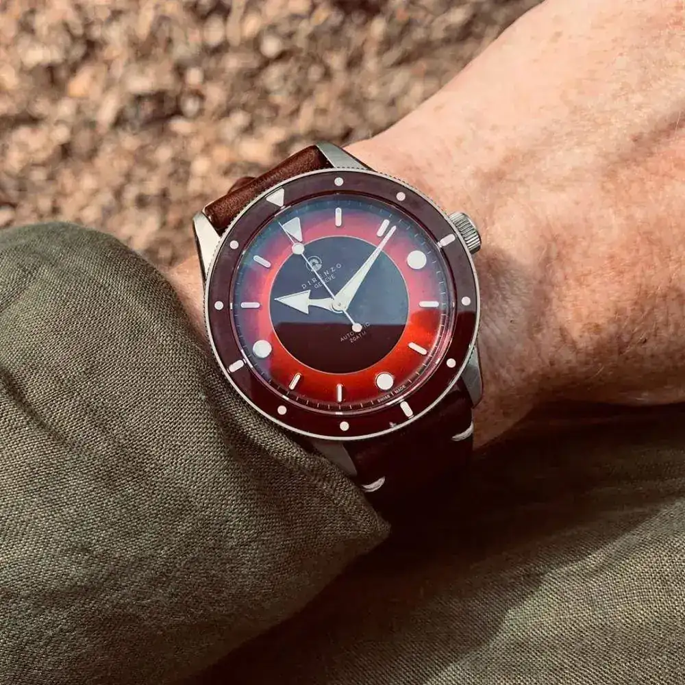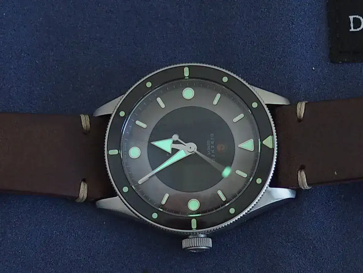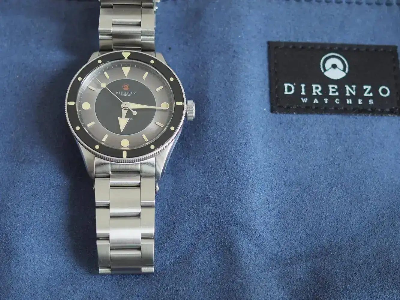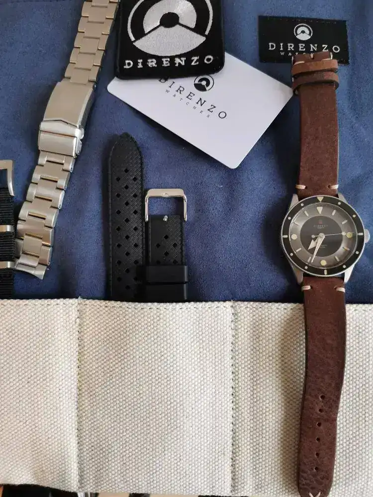 Direnzo siempre cuida los detalles, el reloj llega en un watchroll de tela muy bonito. Trae de serie el armis de acero, una nato y una correa tropic negra. Como extra, muchos pedimos una correa de cuero, de excelente calidad. Todos llevan la marca Direnzo en los cierres.