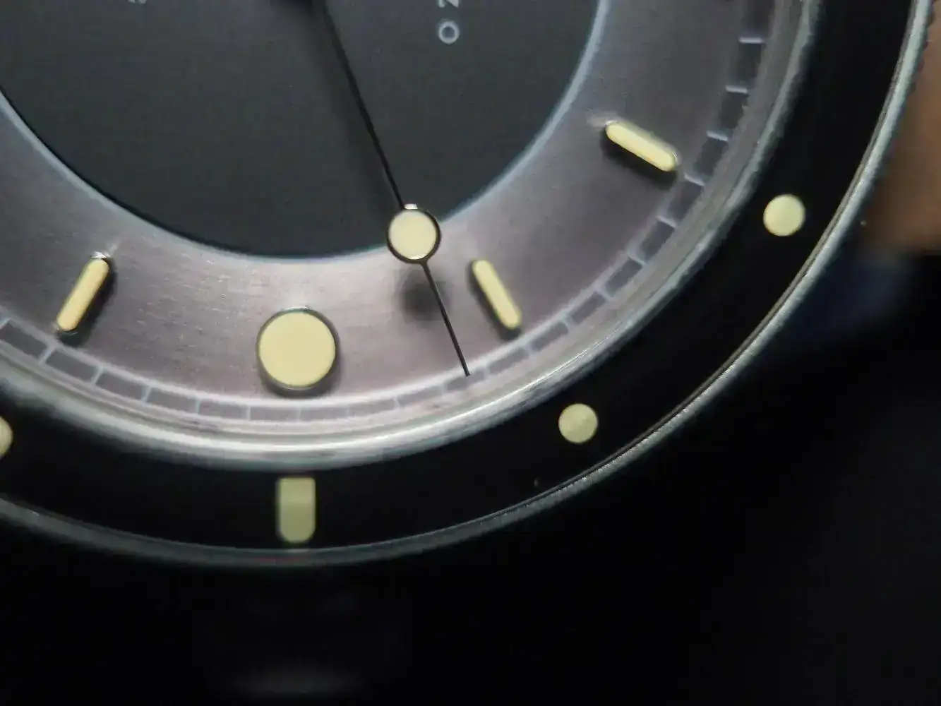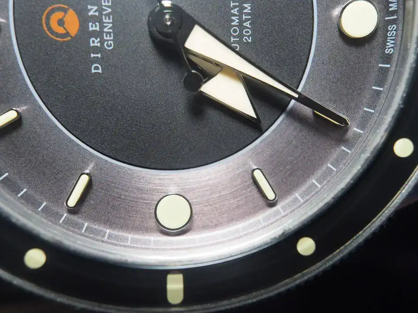 Sergio no esconde sus influencias en la creación de este modelo: Breguet ref. 1646, Omega Seamaster 300 o Jaeger LeCoultre Deep Sea. Sus creaciones se describen como "retro-futuro", y noto esa sensación cuando lo miro. Es a la vez de estilo antiguo, pero parece que tiene influencias de algún comic de ciencia ficción. Este modelo lleva el sobrenombre de "Eclipse" por el efecto del contraste entre el disco central, y el exterior, que nos recuerda a ese fenómeno de la naturaleza. El diseño de dial y agujas está muy cuidado. La bola cerca de la punta de la segundera, alinea justo con el disco interior. Y en el otro extremo, el contrapeso traza perfectamente la curva en la flecha de la aguja de la hora. Los índices tienen un acabado muy fino. (Perdonad, por favor, mis pobres intentos a fotografía macro)