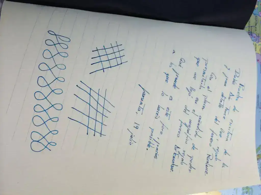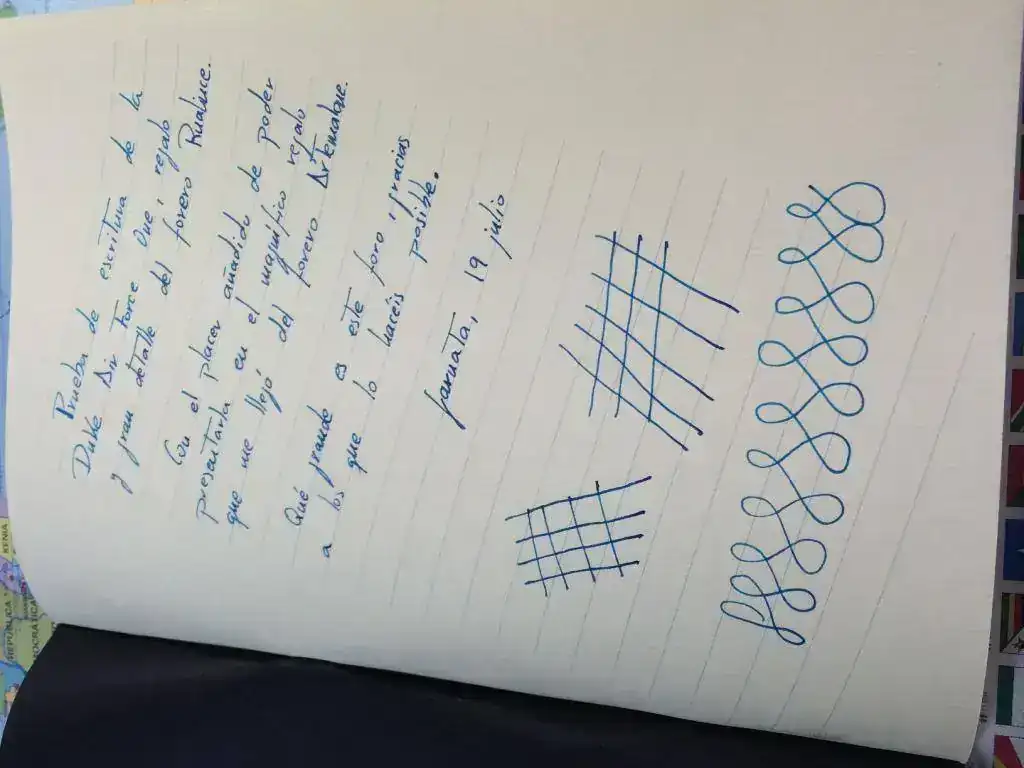 Tengo el enorme placer de presentarla con un cuaderno que me envió de forma totalmente altruista el compañero Artemalone. Si ya el sorteo de la pluma me pareció un ejemplo de lo que es este foro, con gente que no sólo comparte su conocimiento con los demás, sino que regalan estilográficas y amabilidad, el envío de este cuaderno me volvió a dejar con la boca abierta. Un cuaderno hecho con papel Galgo verjurado y una pauta muy original y divertida. Me gustó mucho ir siguiéndola mientras hacía la prueba de escritura. He decidido que el cuaderno lo voy a dedicar a copiar poemas que me gusten, para dedicárselos a mi mujer.