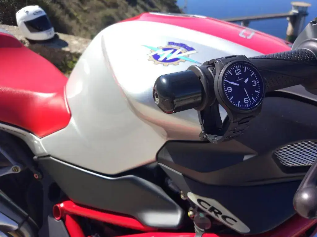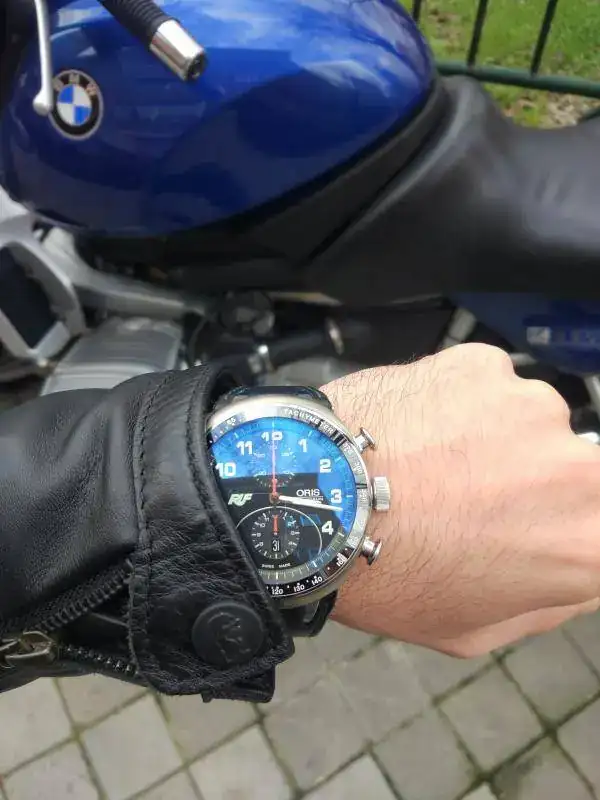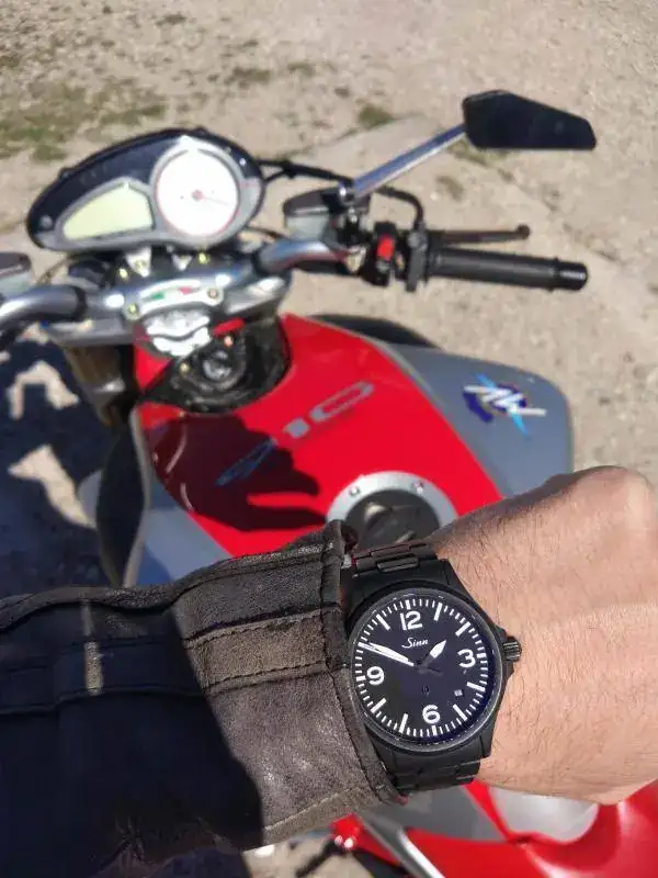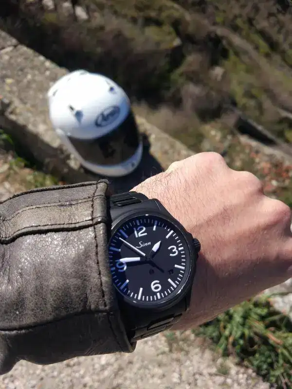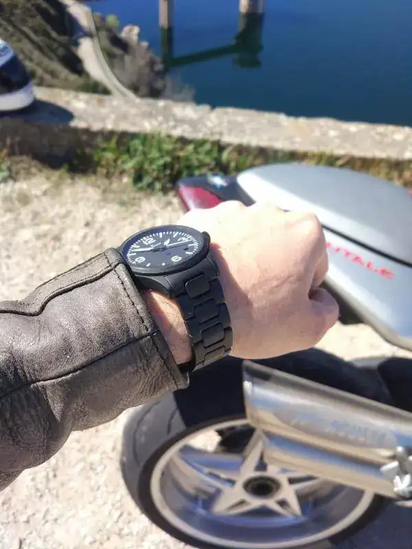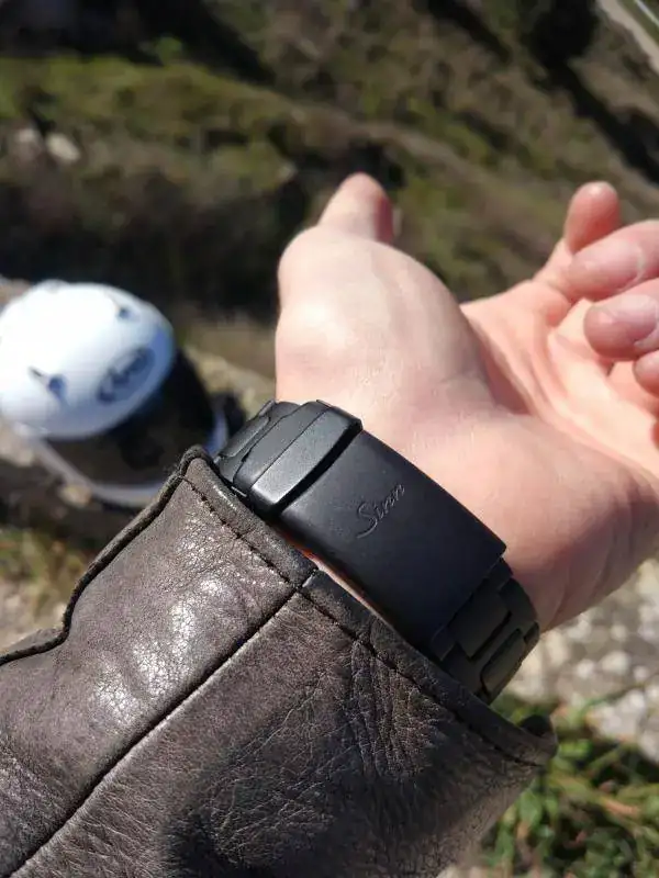 Mención a parte merece el brazalete, en este caso de 20mm de ancho. Estéticamente no es mi brazalete favorito pero pocos he disfrutado tan cómodos. Entre eso y los 10mm que levanta sobre la muñeca se me hace muy cómodo para llevarlo con la moto y la chupa de cuero. Cosa que hago más o menos tranquilo por disponer de la certificación DIN ISO 1413 de resistencia a los golpes.