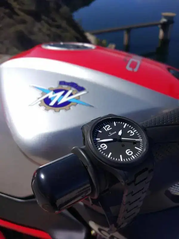 Se trata de un Sinn 656S (y una MV Agusta Brutale 910s). Es un reloj alemán, de contenido tamaño, 38,5mm y 10mm de alto, cuyo objetivo principal es lograr la máxima legibilidad, inspirando su diseño en los relojes que la firma alemana colocaba en las cabinas de avión antaño. Su otra característica es su antimagnetismo, de 80,000 A/m, el mismo que un Rolex Milgauss. Característica que anuncia orgulloso con un pequeño logo encima de las 6.