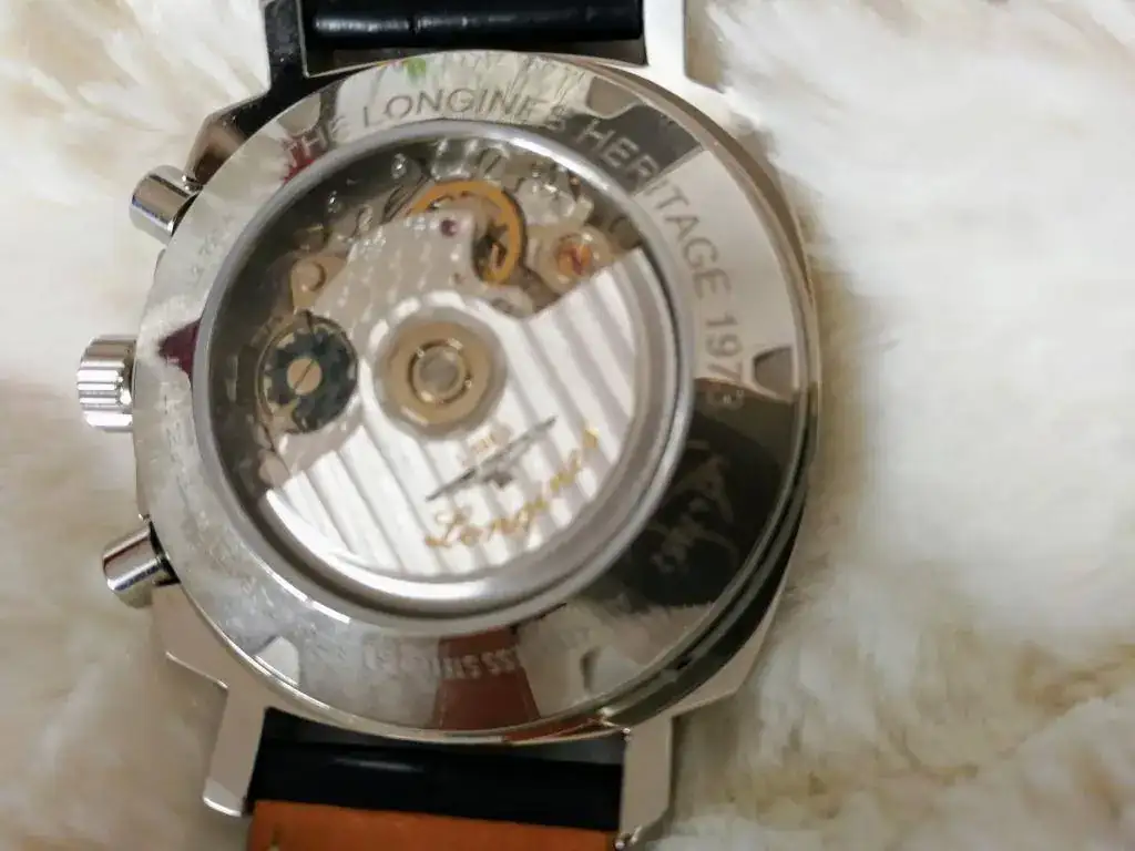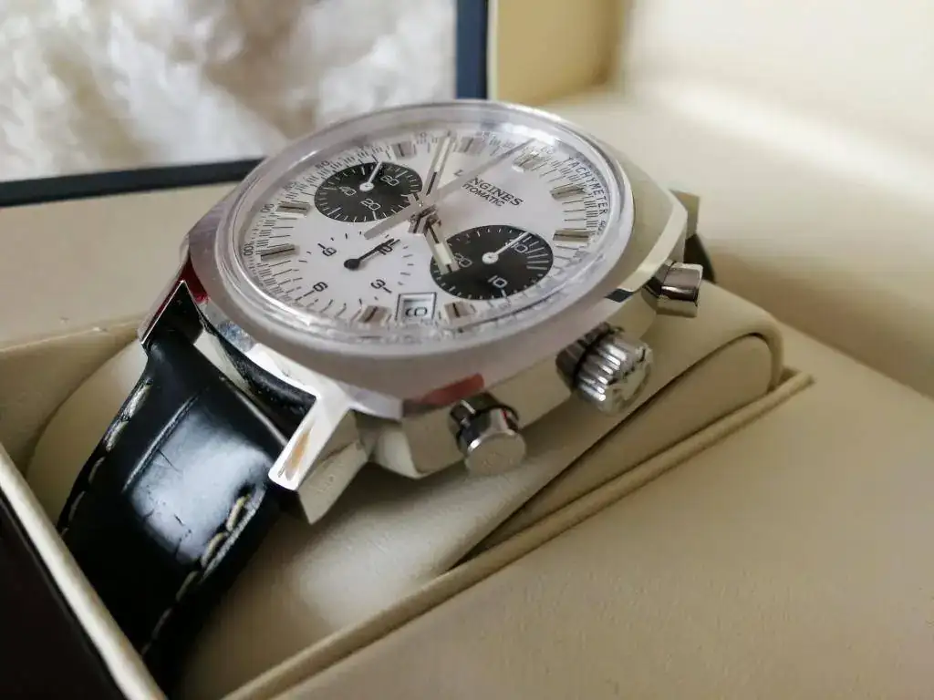 El calibre es el L.688.2. Un ETASA hecho en exclusiva para Longines, con lo que yo creo que podria denominarse "in-house". Cronografo a rueda de pilares ( en azul).