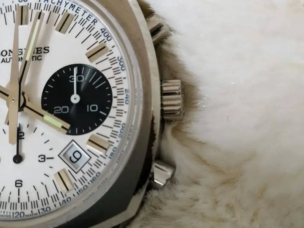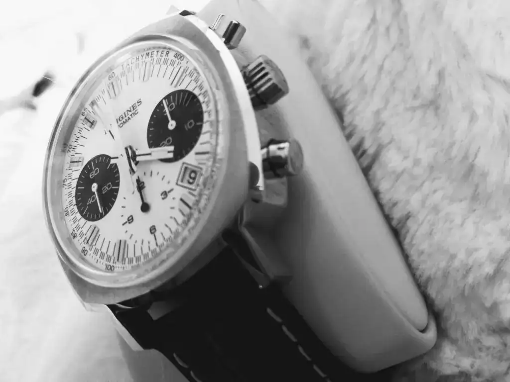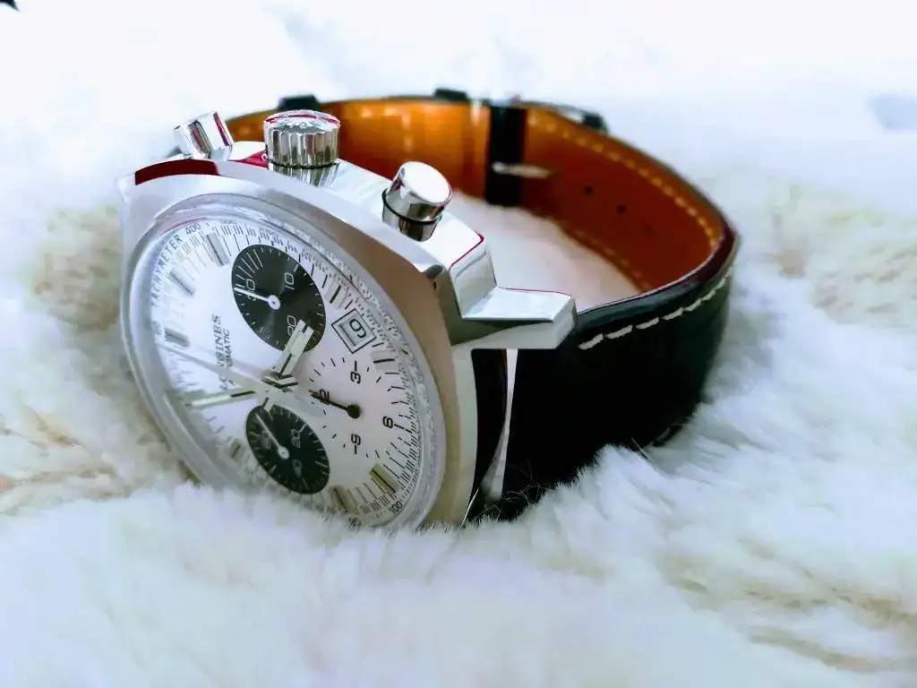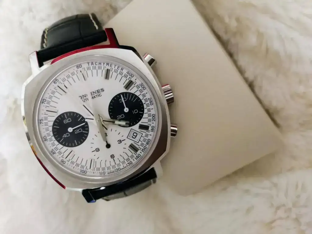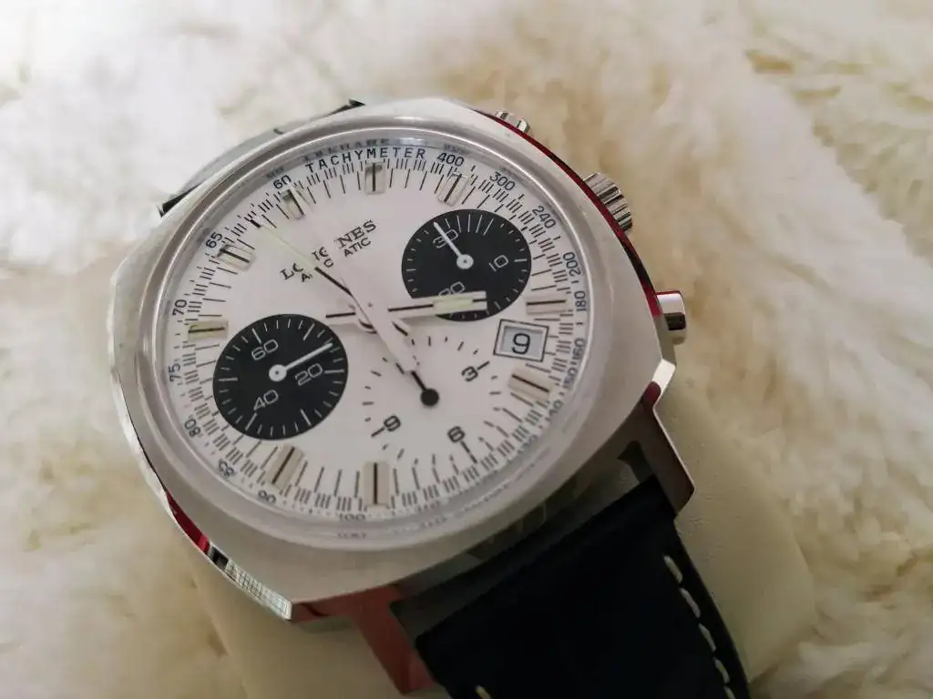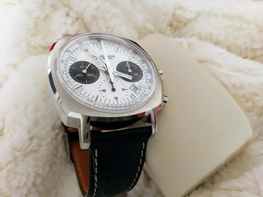 La caja, como se vé, es tipo cojin (muy de los 70) y es heredera del Heuer Camaro y del Longines Conquest con el calibre CH30.
