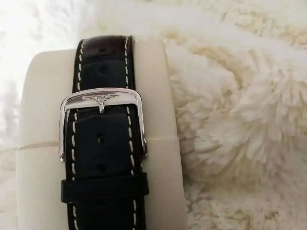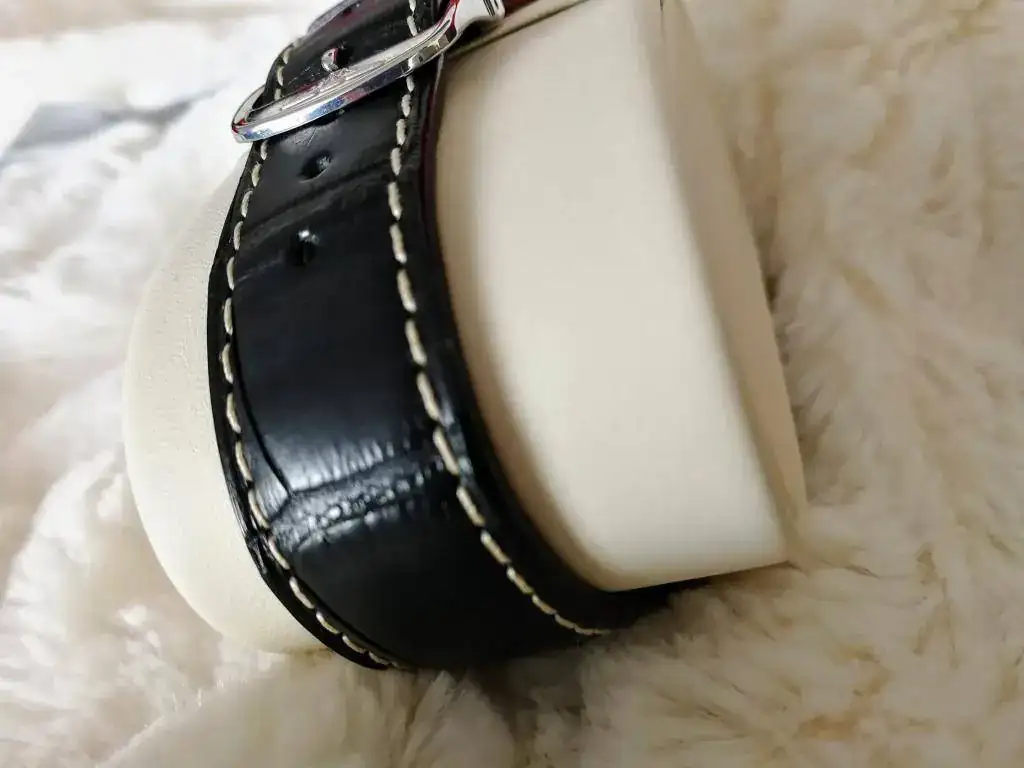 La correa es de cocodrilo. Muy suave y dúctil, y un color que negro que enamora. Hebilla firmada, claro estaba!!