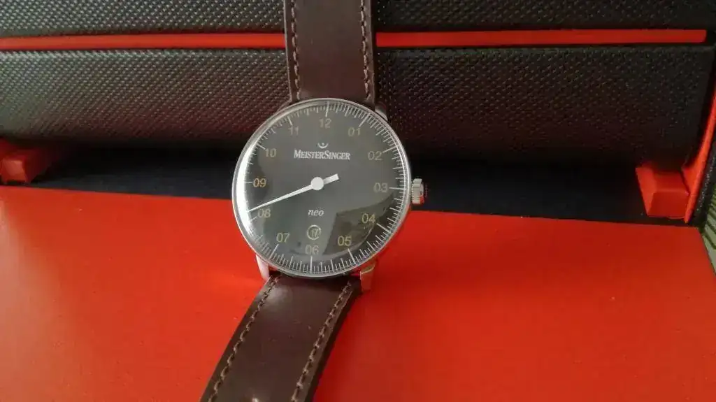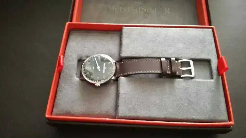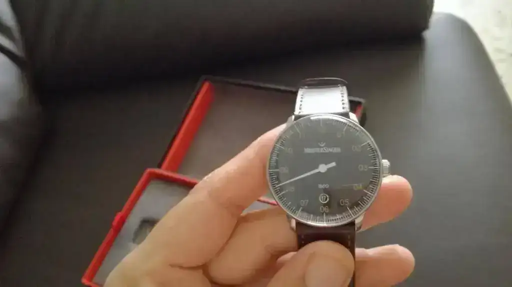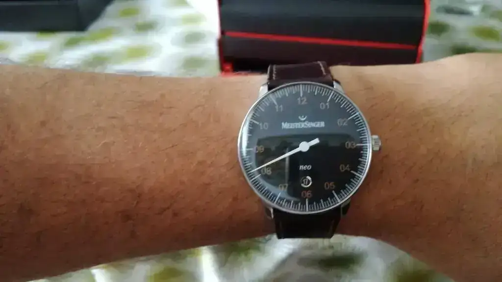 Vaya por delante que no me gustan los monoaguja (me parecen un tensiómetro o la esfera del aparato de medir la presión de los neumáticos), ni el plexiglás, me gustan los relojes mínimamente sumergibles, con corona roscada... pero dos cosas me hicieron comprar este reloj: la primera es que a mi novia le encantó y ni quiso seguir viendo tiendas ni modelos (y yo pensando "tengo un presupuesto como para comprar un reloj el doble o triple de caro, me puedo comprar un crono de Longines, o cualquier otro relojazo y voy a comprar esto?) y la segunda es la filosofía de la marca Meistersinger, todo esto de medir el tiempo de forma más relajada, sin estar pendiente del segundo o minuto, me gustó, además de que tras dos infartos, el cardiólogo así me lo dice. Aparte, yo he sido músico profesional muchos años y el logo y nombre de la marca me llamaron la atención, el logo es un calderón, un signo que en música indica un parón o descanso en la obra musical, un parón en el tiempo de duración variable según criterio del intérprete/director: