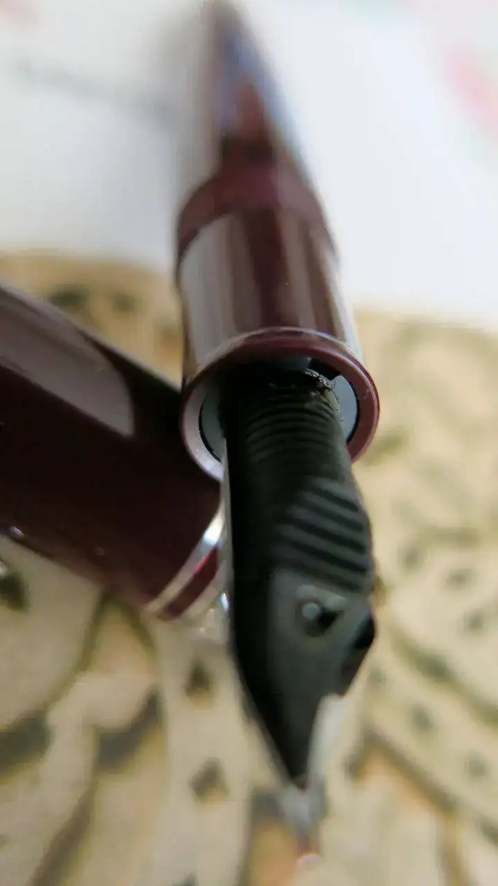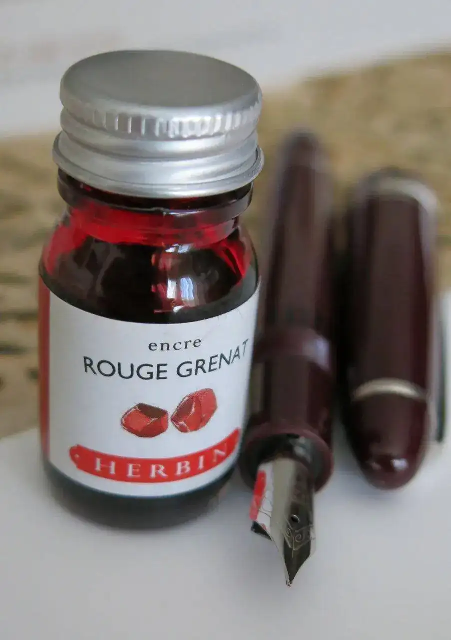 La estoy usando entintada con Rouge Grenat de J. Herbin, un color de tinta que armoniza perfectamente con el tono de la pluma y que, siendo muy atractivo, no es estridente pese al tono burdeos.