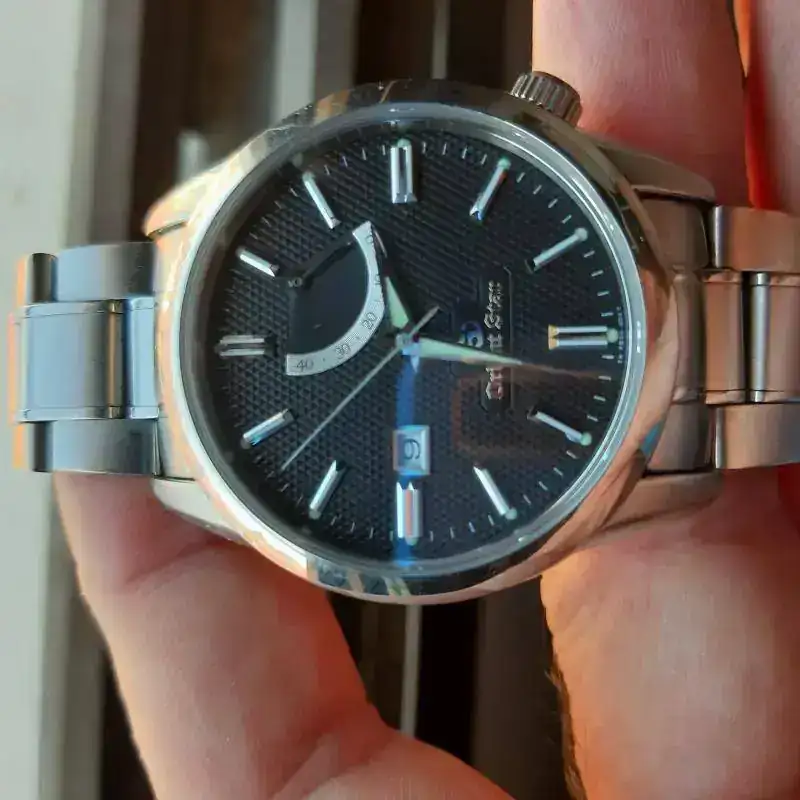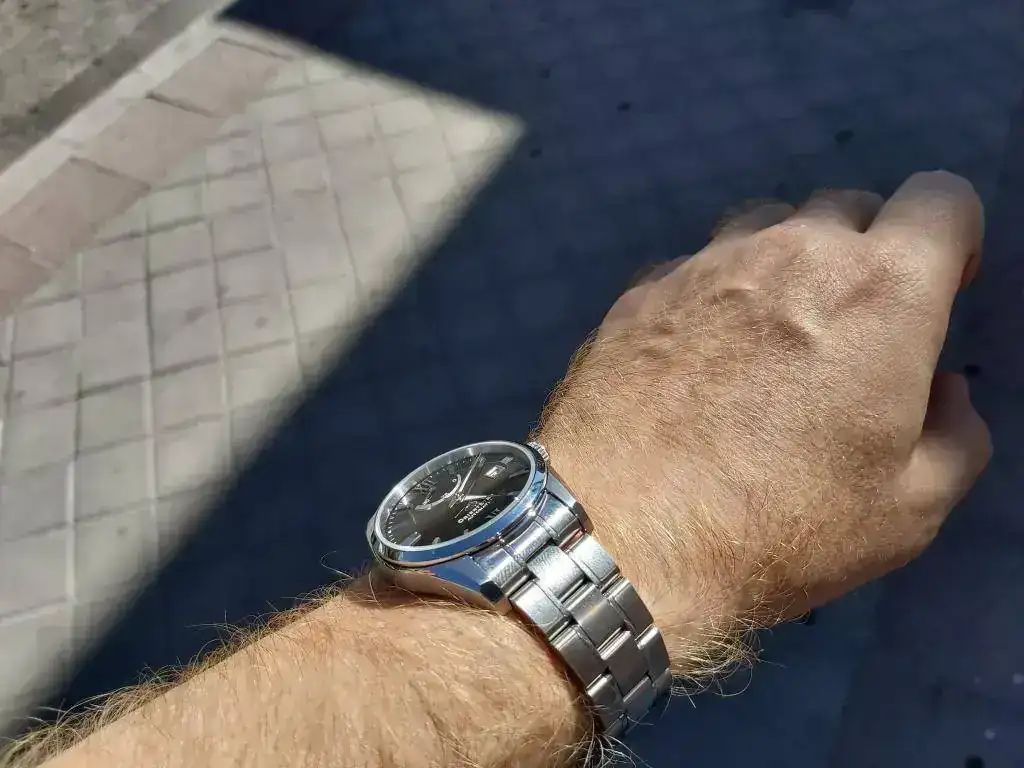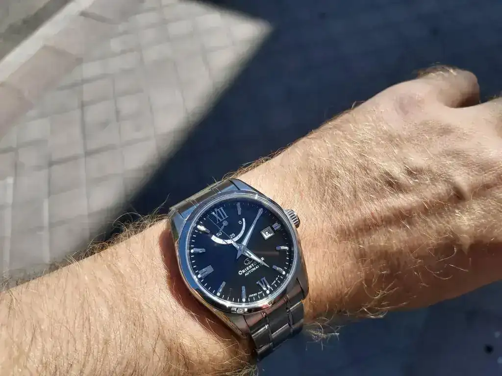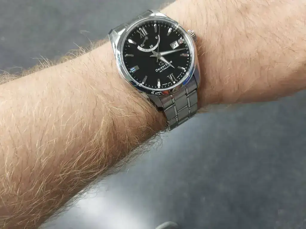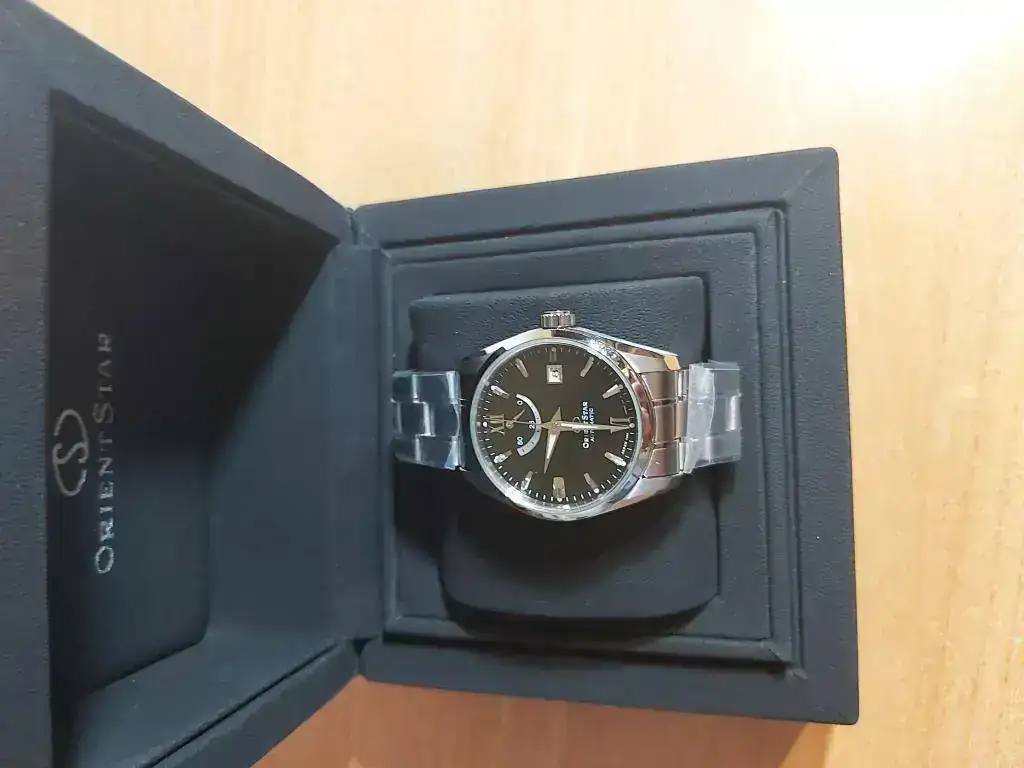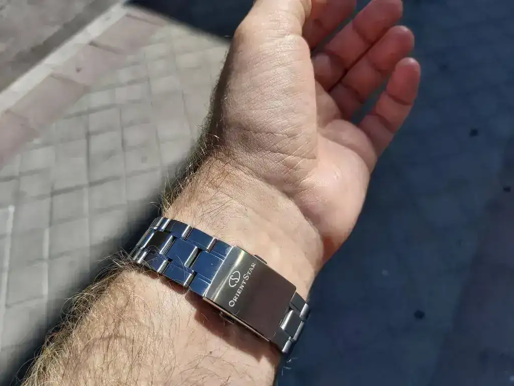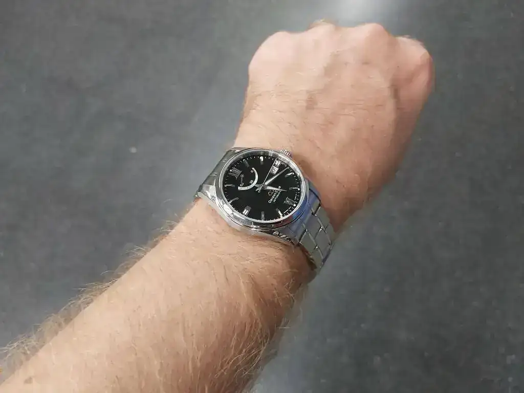 El calibre tiene remonte manual y parada de segundero. Destaca por la reserva de marcha de 50 horas. Por ahora no puede hablar de su precisión, porque lo recibí hace un día. Me han gustado sus acabados, tanto la caja como el armis tienen zonas pulidas a espejo como otras cepilladas. Otros relojes al poco tiempo de usarlos, observaba que se rayaban con la simple fricción sobre la mesa del PC al usar el ratón. La esfera me parece muy equilibrada con sus indicadores metálicos de las horas, resaltando las XII y las VI en números romanos. A bastantes aficionados no les gusta el indicador de reserva de marcha. Orient lo patentó y por esto lo llevan muchos modelos de gama media y alta. Para mi queda muy bien, haciendo un poco más compleja la esfera, tiene unos micro surcos que al darle la luz producen unos bonitos destellos. El calibre se observa por el cristal trasero y está bastante decorado. En general me parece un reloj de gran calidad, para su precio, con un diseño elegante y actual, con muy buenos acabados en la caja y armis. Estuve buscando relojes de menos de 600 euros en Seiko, Orient, Certina, Tissot, Mido etc., y no encontré ninguno que me me gustase más. Tenía ganas de comprar un reloj suizo, pero no encontré ninguno que me convenciese, ni incrementando el precio. En mi opinión los japoneses dan mucho más a menor precio. Comparado con los M force, curator y mako que tengo, me llama la atención el brillo del acero en este Orient Star. Os pongo unas fotos. La última es de un Citizen de 43 mm, creo que este reloj de 38,5 mm no se ve pequeño en una muñeca como la mía, de 17 cm. Ya me diréis que os parece este Orient Star.