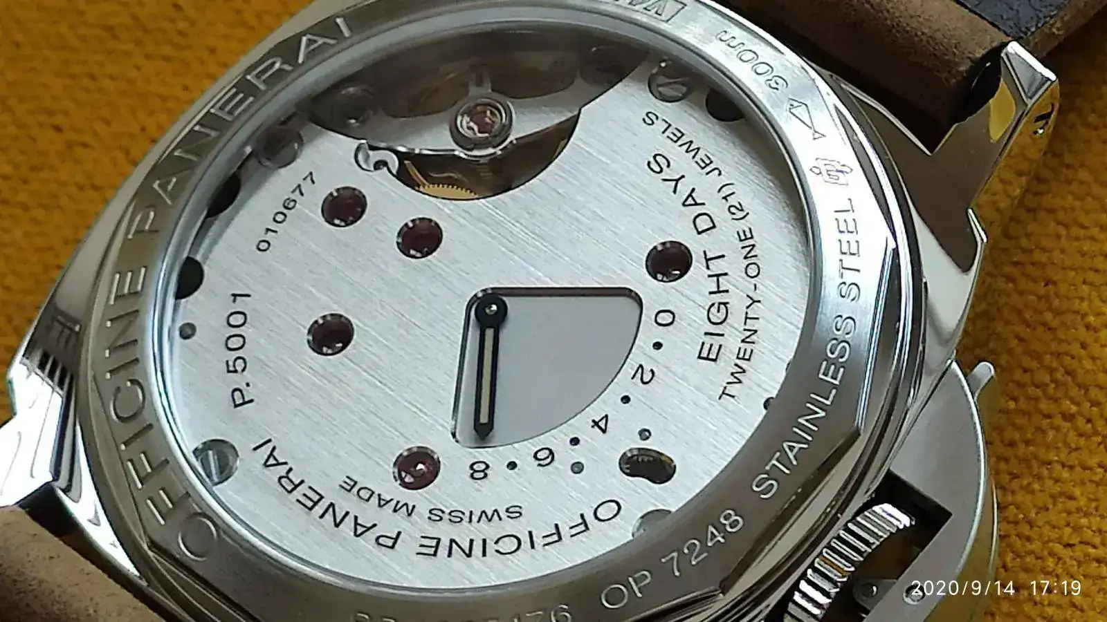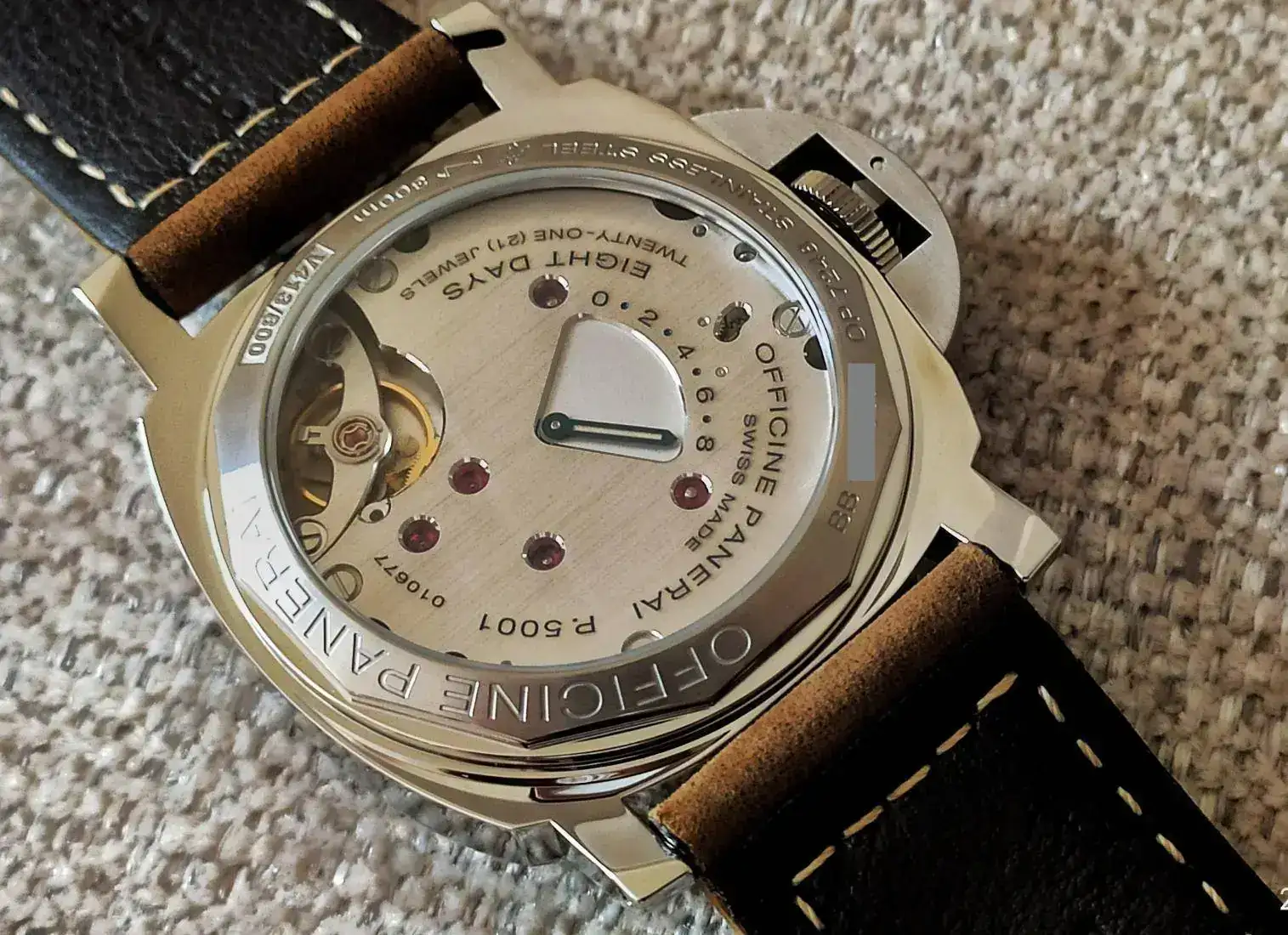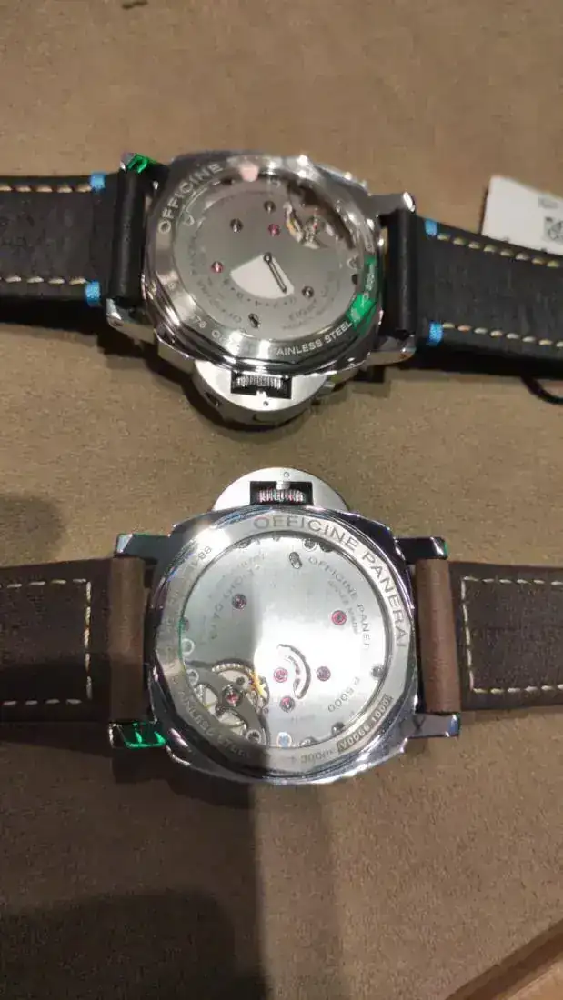 Me habría gustado que en la esfera pusiera arriba Luminor Panerai, y abajo, solo 8 giorni, como el 914... pero todo no se puede tener! un aspecto que me parece lo más delicioso, es el calibre. Tiene un tacto suave, sedoso, la corona se acciona en medio segundo! es decir, es un reloj sumergible 300 metros con "corona a rosca", solo que la rosca es una palanca muchísimo más cómoda de manipular, no te da pereza. Y al ser manual, siempre sabes la carga que tiene... pero hay más ventajas. No me preocuparé por si hoy me he movido mucho o poco, ni de ponerlo en un winder... 5 minutos de placentero momento de dar cuerda cada 8 días (o más según he leído, Pam garantiza mínimo 192 horas), y a disfrutar... sabiendo la reserva que le queda (aunque no puedas verlo como en otros modelos, pero sabes el día que le diste), que te da igual si tu día es activo o no, si mañana lo usarás o no... una obra maestra la verdad. Igual que en un automático lo veo más irrelevante porque no sabemos la carga real, en un manual, me parece una genialidad dotarle de semejante reserva.