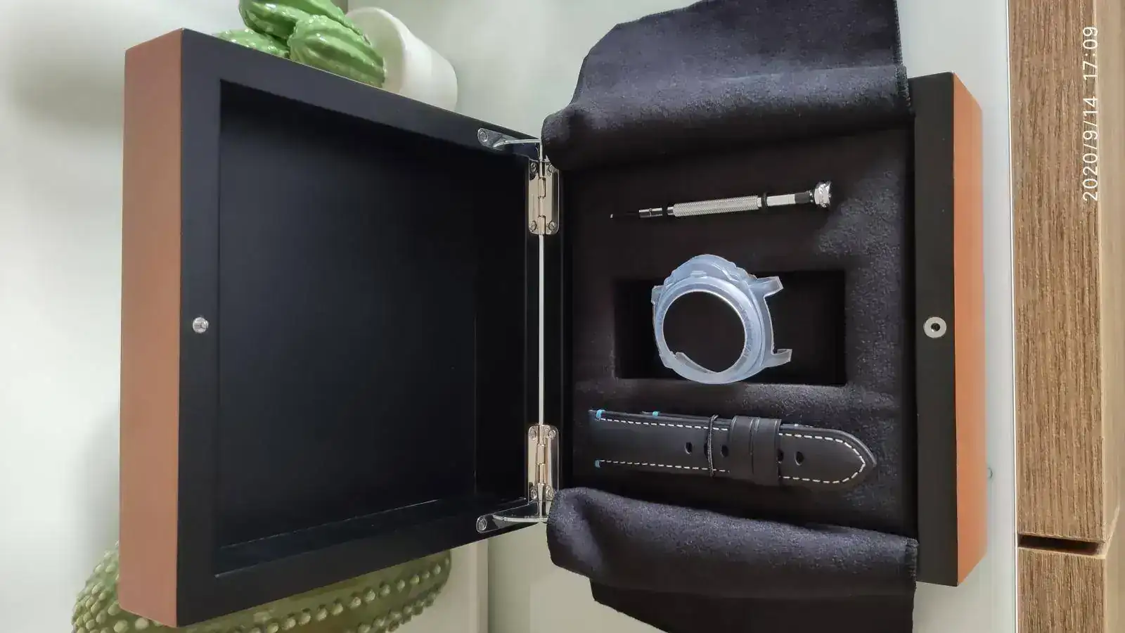 La dotación y presentación del reloj es genial. Una caja de madera de peral, grabada arriba, todo super bien envuelto y protegido. Viene con su destornillador o herramientas de presión según modelo, el caucho, una mopa de limpieza, otra larga que sirve para poner el reloj al cambiarle la correa, el protector de goma del reloj... en el fondo, la documentación en una tarjeta, además de una en "cartón" que se separa de la parte que se queda el CO, donde figura tu nombre, fecha y demás datos del reloj. Una gran gran presentación, una dotación muy completa que se agradece, porque aunque la cobren, la dan. Y además un tamaño de caja y demás que resulta cómodo de guardar sin ser excesivamente grande, y tampoco pequeña que desmerezca el reloj. Genial la verdad.