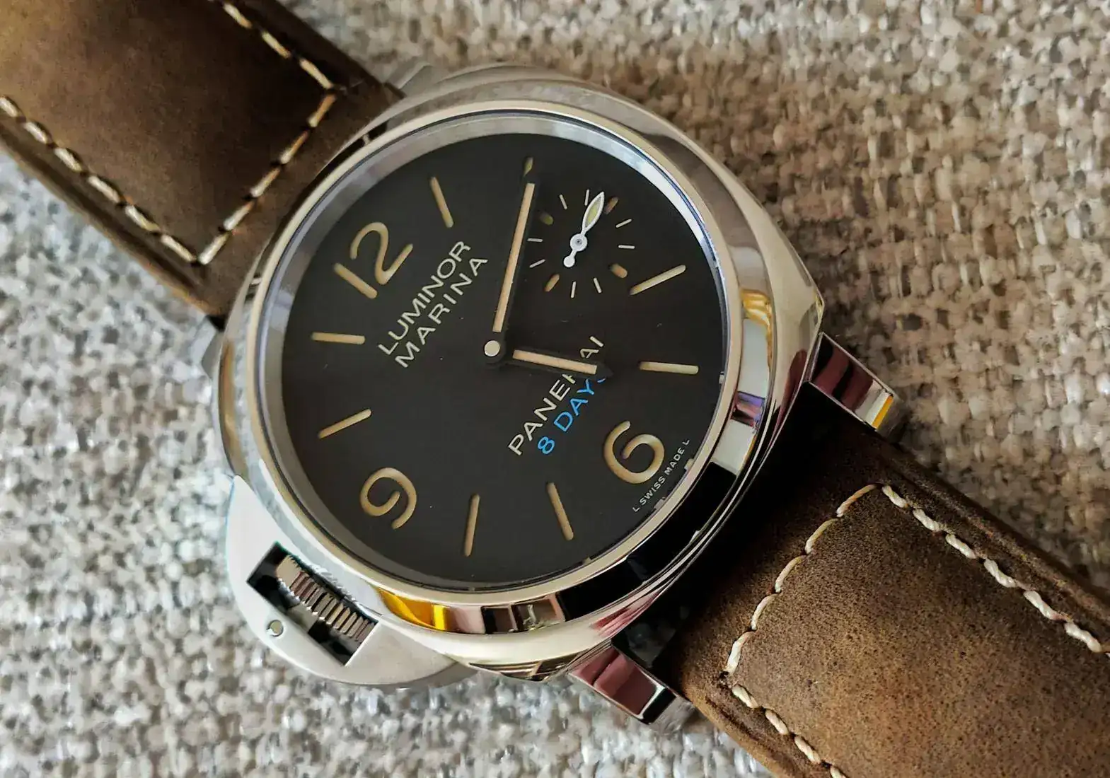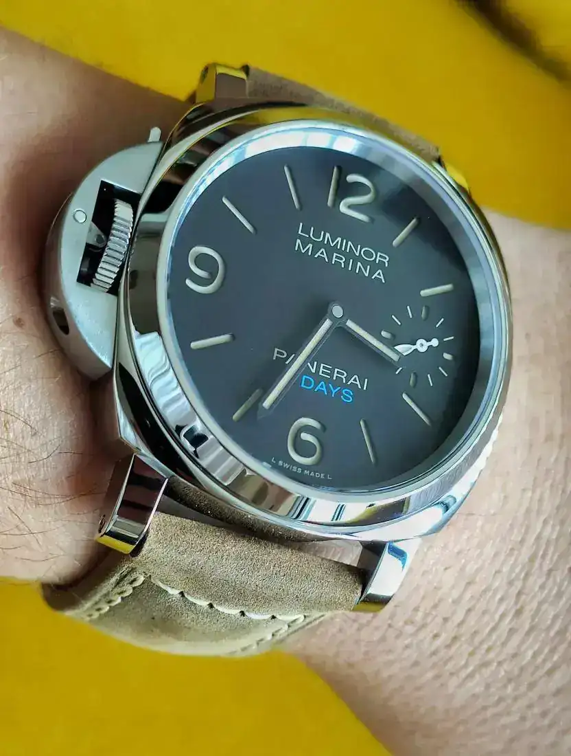 Todo empezó el día que me dio por probar un 1312 en otro concesionario, y ver que esos 44mm, si bien es un reloj grande de esfera, me quedaban perfectos. Sabes que un Pam es grande de por sí, así que mentalmente vas predispuesto, pero una vez en la mano, fuese el modelo que fuese, lo veía perfecto de tamaño para su estética tan característica. Será por el fondo plano y grande que asienta tan bien, o que a pesar del lug entre puntas de asas que puede distraer de la realidad, la correa "nace" muy rápido desde la caja y eso hace que no se vea grande...ahí la importancia del toqueteo y prueba siempre de los relojes y no solo guiarnos por la publicidad. La sobriedad de esas esferas satinadas o mate, los diales sándwich... la verdad que no podía estar más equivocado. La diferencia entre cajas y modelos es abismal, parece mentira como con los mismos elementos, algo puede cambiar tanto. La cuestión es que todo quedó ahí, como en reposo y espera, hasta cumplir antes otros objetivos. Por suerte, esos objetivos no quieren ser alcanzados por la parte vendedora, así que decidí avanzar en ese plan. Bendita la hora!