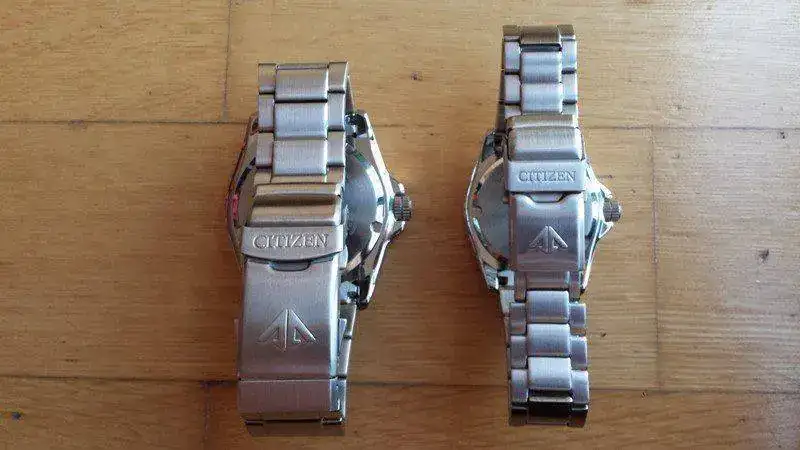 - Cierre: la versión masculina no tiene microajuste, lo que en mi caso es un poco jodienda, porque me quedo entre dos eslabones. Lo soluciono dejándolo con un eslabón de menos en vez de uno de más y compensando con la extensión de buceo cuando tengo la muñeca más hinchada, pero habría estado mejor tener microajuste. La versión femenina no tiene extensión de buceo, pero a cambio sí tiene microajuste. Es la única diferencia, aparte del calibre y el tamaño, con respecto a la masculina.
