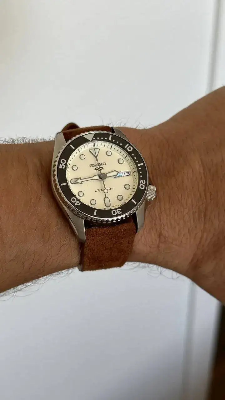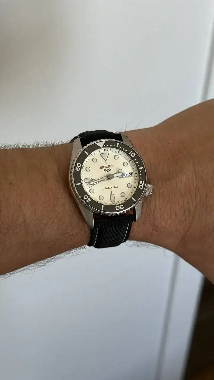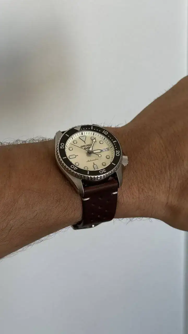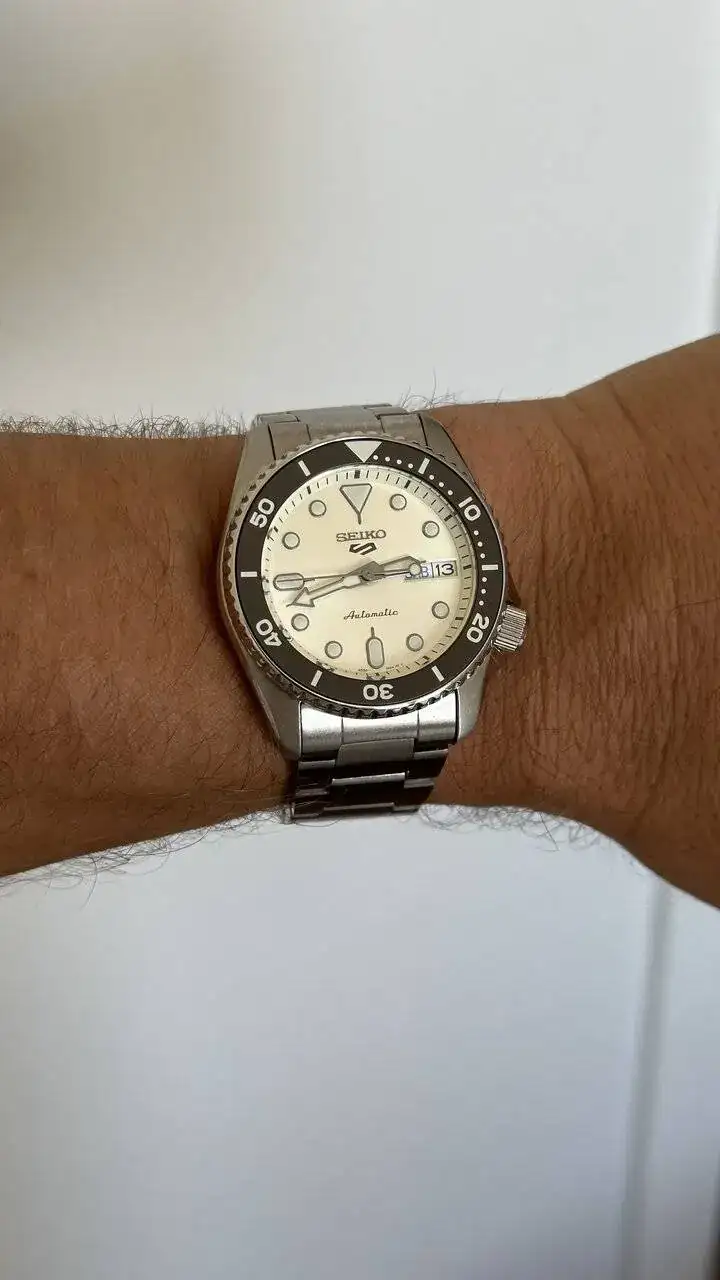 Y cual ha sido?? Pues un srpk31, los “nuevos” skx de 38mm, con el dial en blanco/crema. Decir que la clave ha sido el color, es espectacular en directo. Tiene una legibilidad estupenda y combina con todo. Ademas lo hace un pelín mas grande a la vista que el negro, sin que se vea así el exterior en la muñeca.